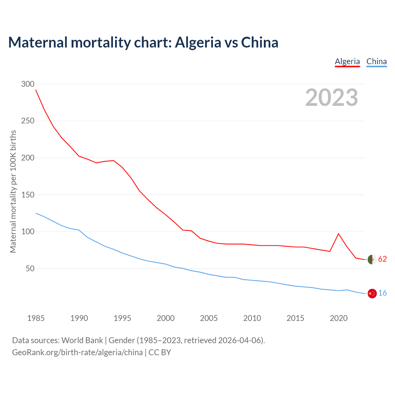The maternal mortality rate, which is the probability of dying during childbirth or within 42 days of pregnancy termination, is 62 deaths per 100,000 live births in Algeria, compared to 16 deaths in China.