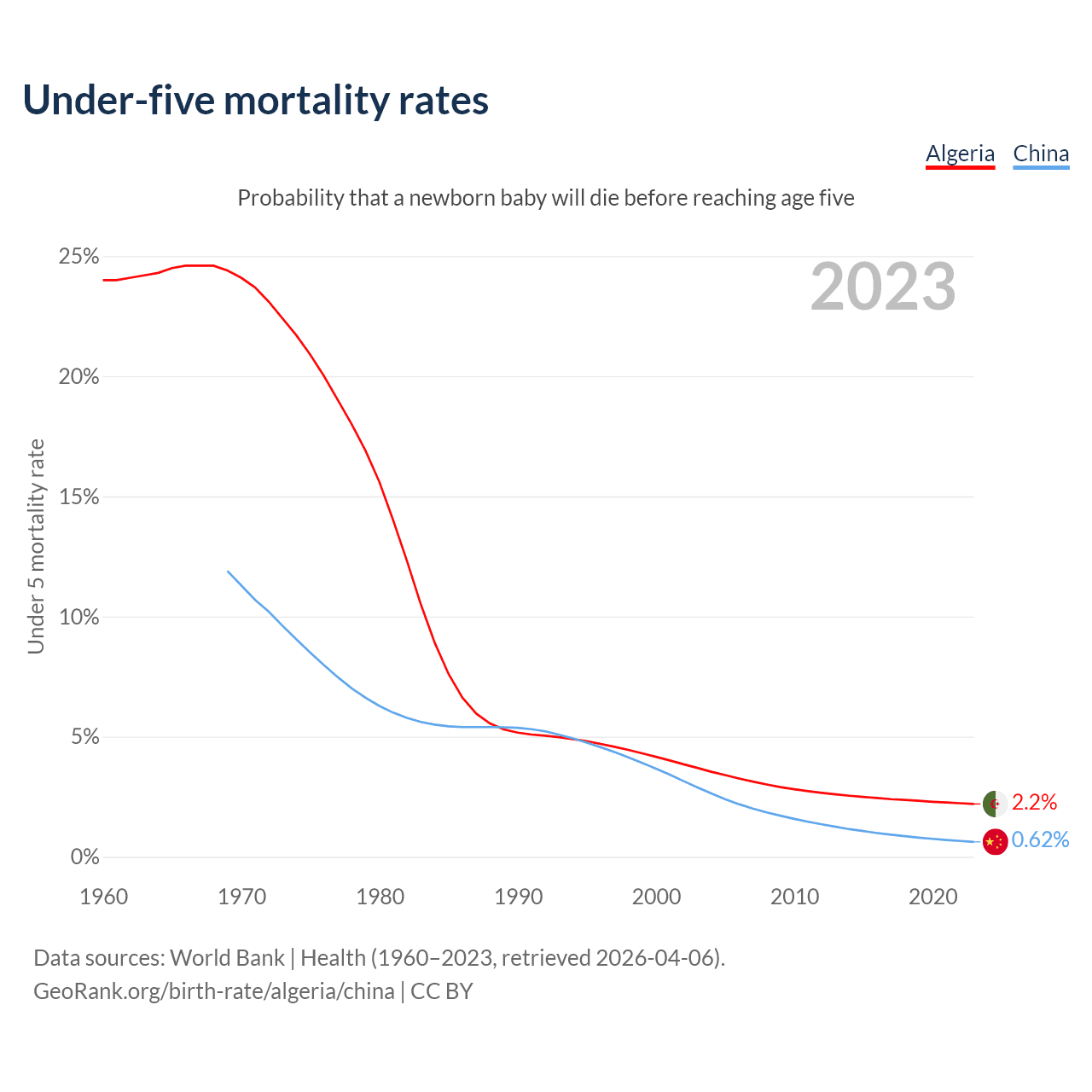 The chance that a newborn baby will die before reaching age five is 2.2% in Algeria and 0.62% in China. Above is a chart with historical data on under-five mortality rates.