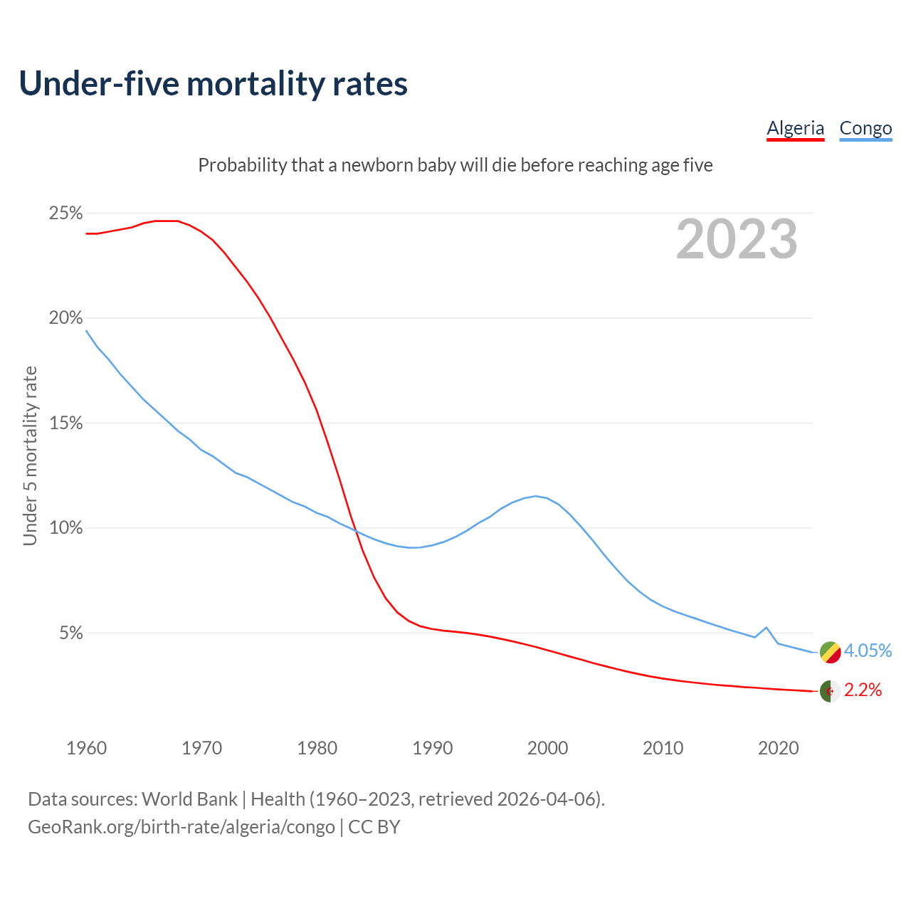 The chance that a newborn baby will die before reaching age five is 2.2% in Algeria and 4.05% in the Congo. Above is a chart with historical data on under-five mortality rates.