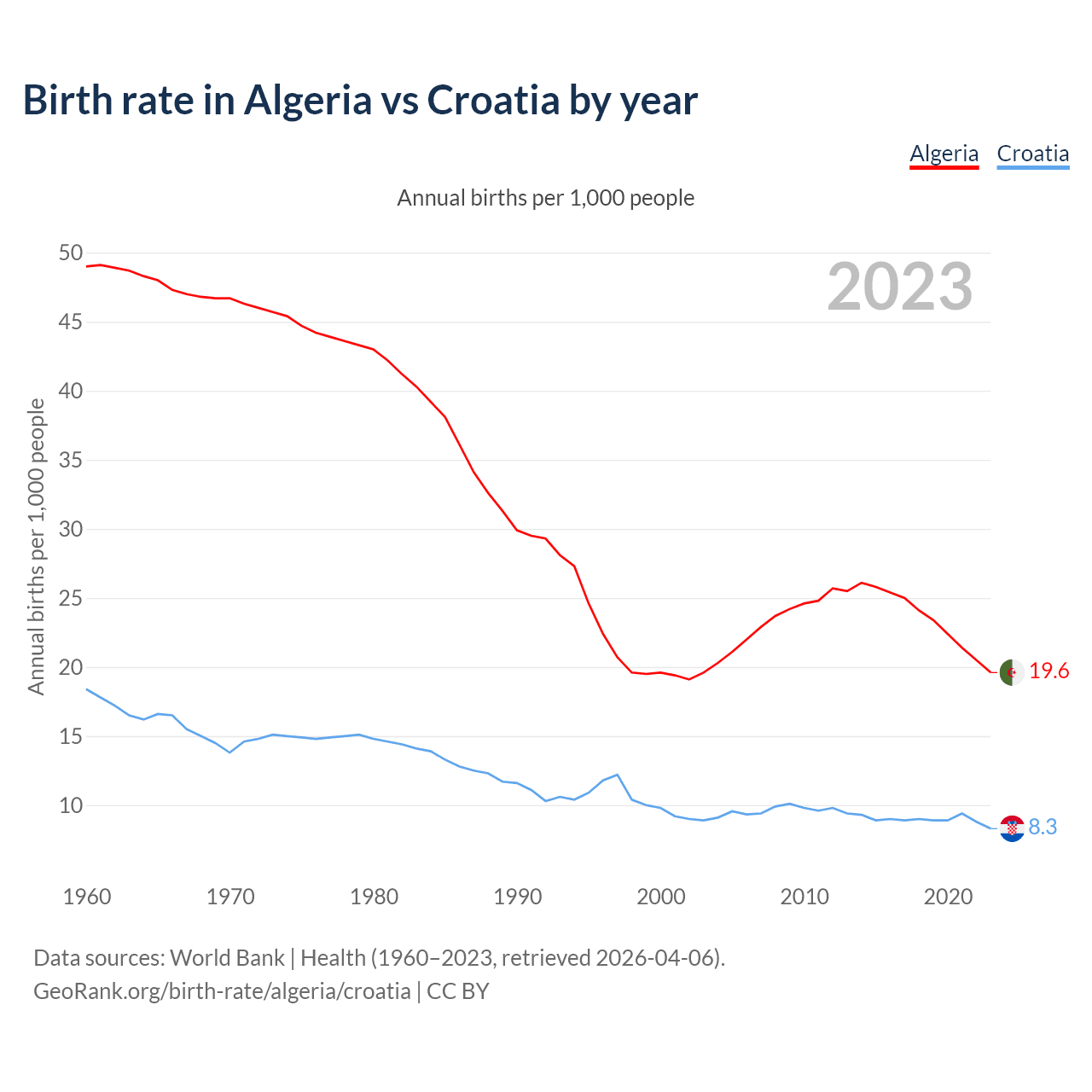 Algeria has an annual birth rate of 19.6 births per 1,000 people, compared to 8.3 for Croatia. The average number of children a woman is expected to have during her lifetime — the fertility rate, is 2.77 in Algeria and 1.46 in Croatia — 47.2% difference.