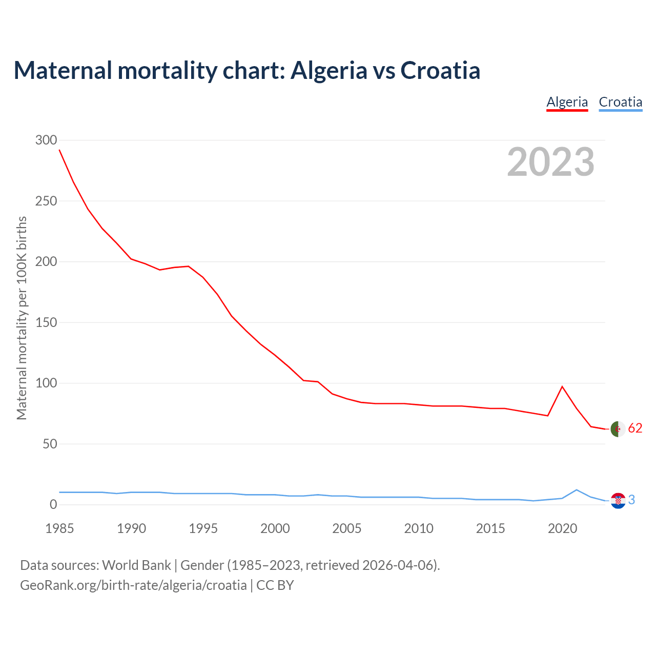 The maternal mortality rate, which is the probability of dying during childbirth or within 42 days of pregnancy termination, is 62 deaths per 100,000 live births in Algeria, compared to 3 deaths in Croatia.