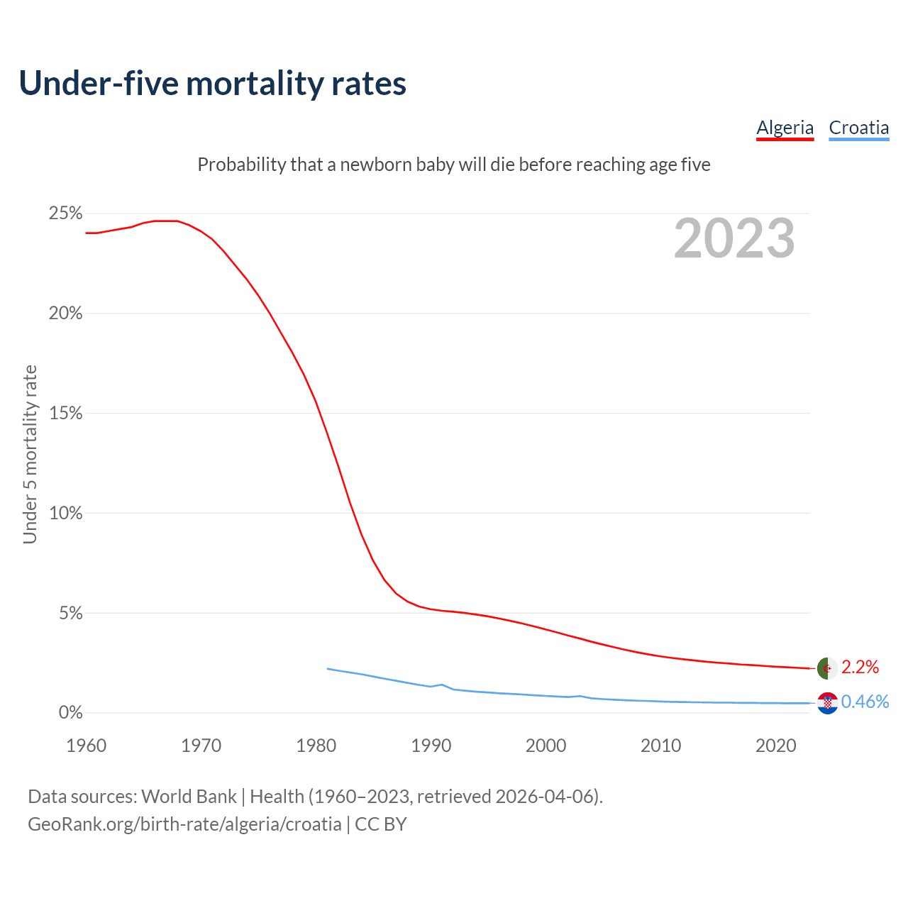 The chance that a newborn baby will die before reaching age five is 2.2% in Algeria and 0.46% in Croatia. Above is a chart with historical data on under-five mortality rates.