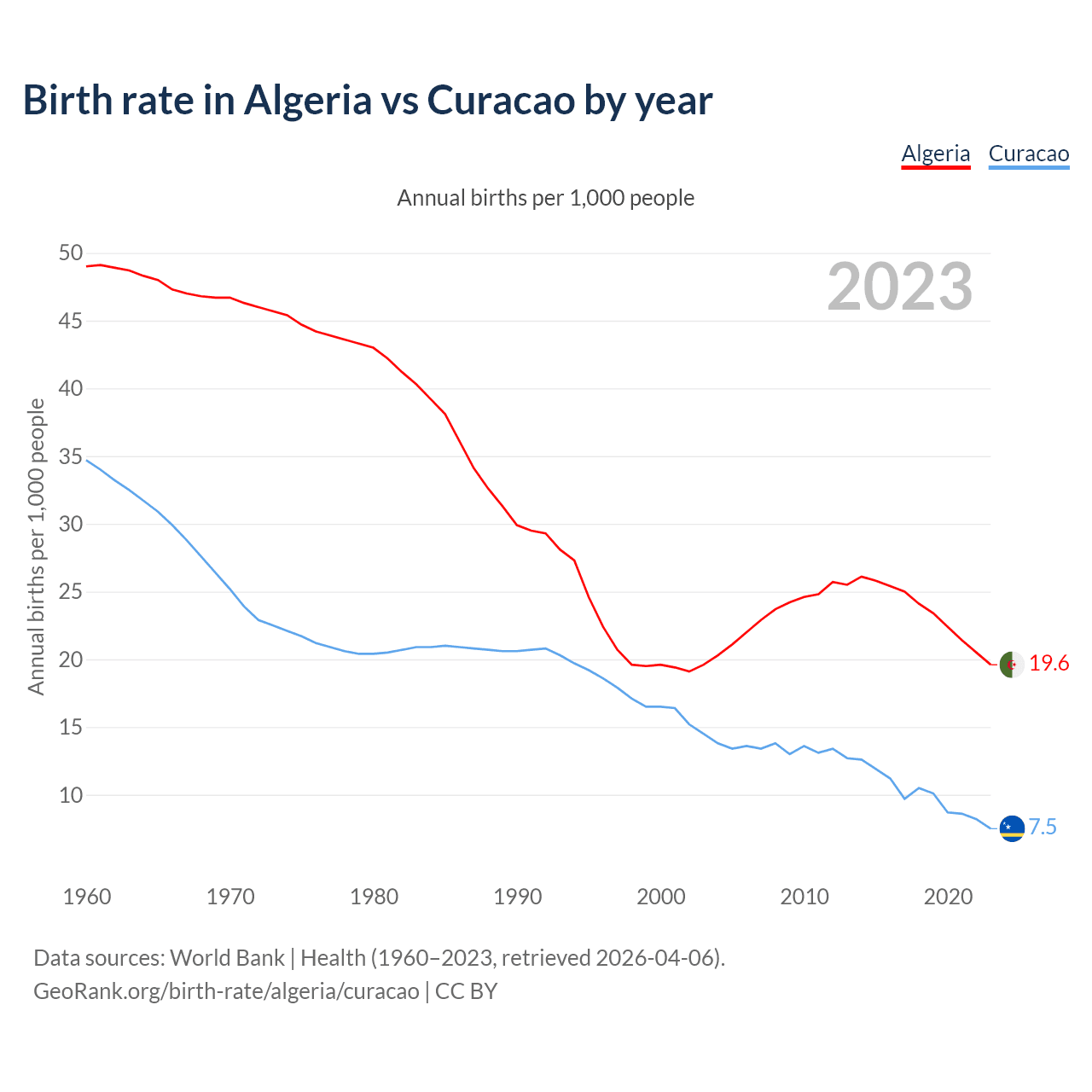 Algeria has an annual birth rate of 19.6 births per 1,000 people, compared to 7.5 for Curacao. The average number of children a woman is expected to have during her lifetime — the fertility rate, is 2.77 in Algeria and 1.2 in Curacao — 56.6% difference.
