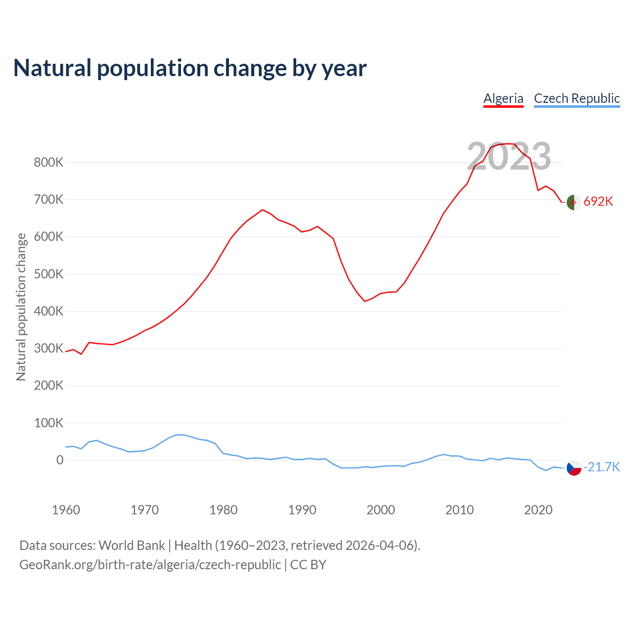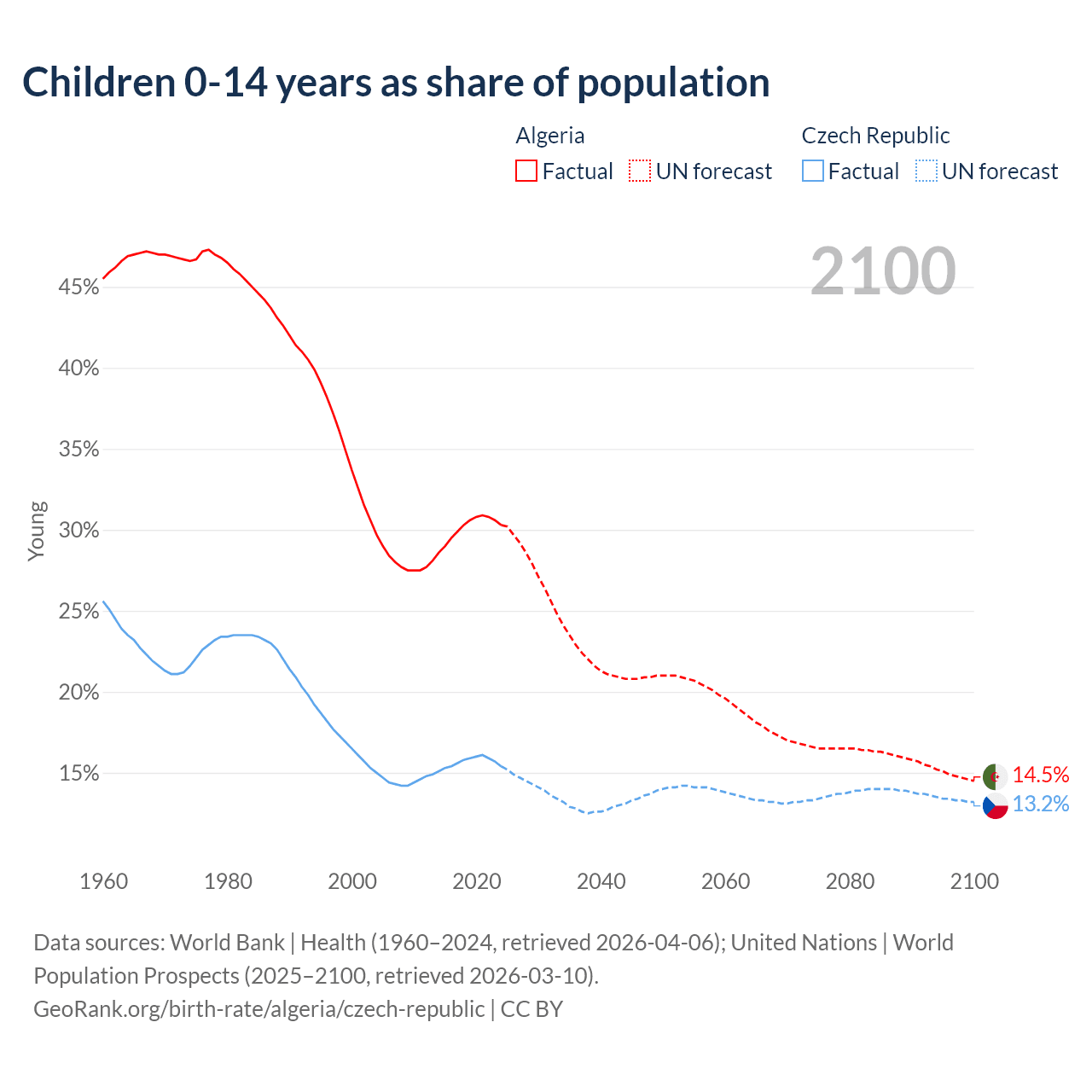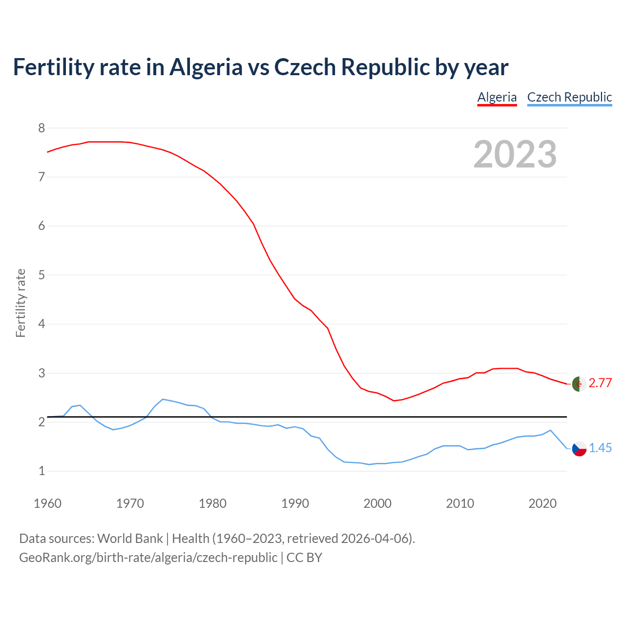 According to the latest available data on birth rates, the fertility rate in Algeria was 2.77 children per woman in 2023, compared to 1.45 in the Czech Republic in 2023. The replacement level is considered to be 2.1 children per woman.