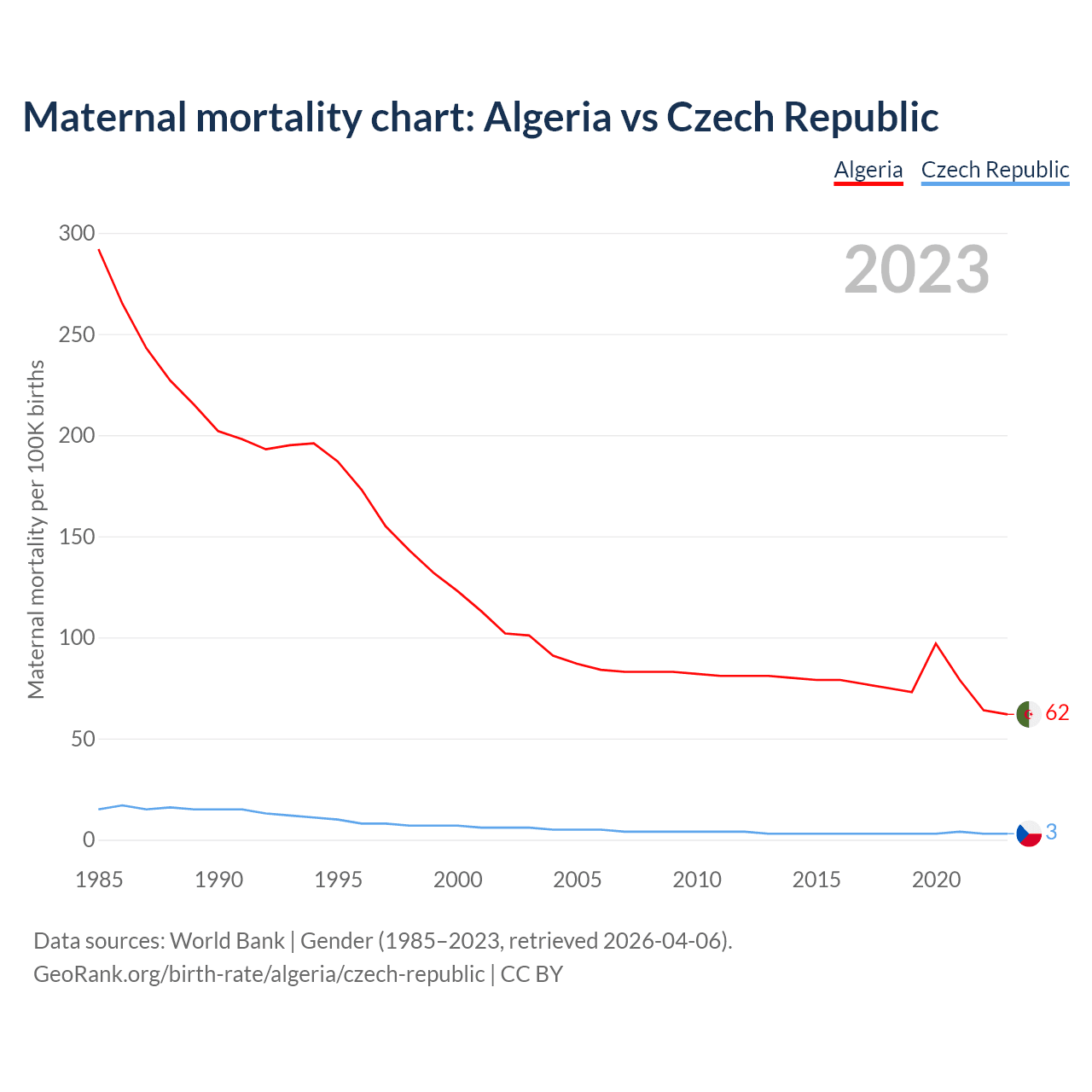 The maternal mortality rate, which is the probability of dying during childbirth or within 42 days of pregnancy termination, is 62 deaths per 100,000 live births in Algeria, compared to 3 deaths in the Czech Republic.