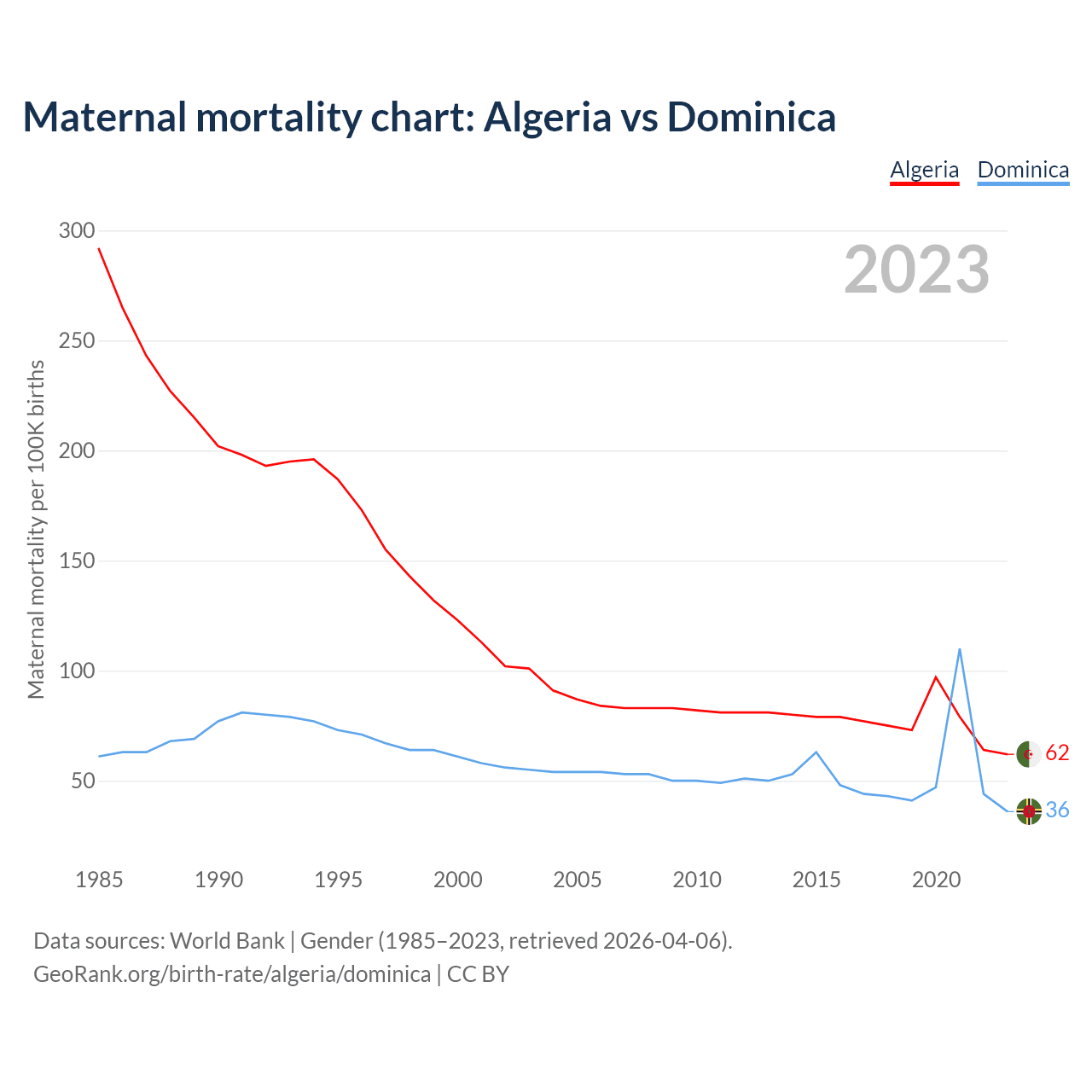 The maternal mortality rate, which is the probability of dying during childbirth or within 42 days of pregnancy termination, is 62 deaths per 100,000 live births in Algeria, compared to 36 deaths in Dominica.