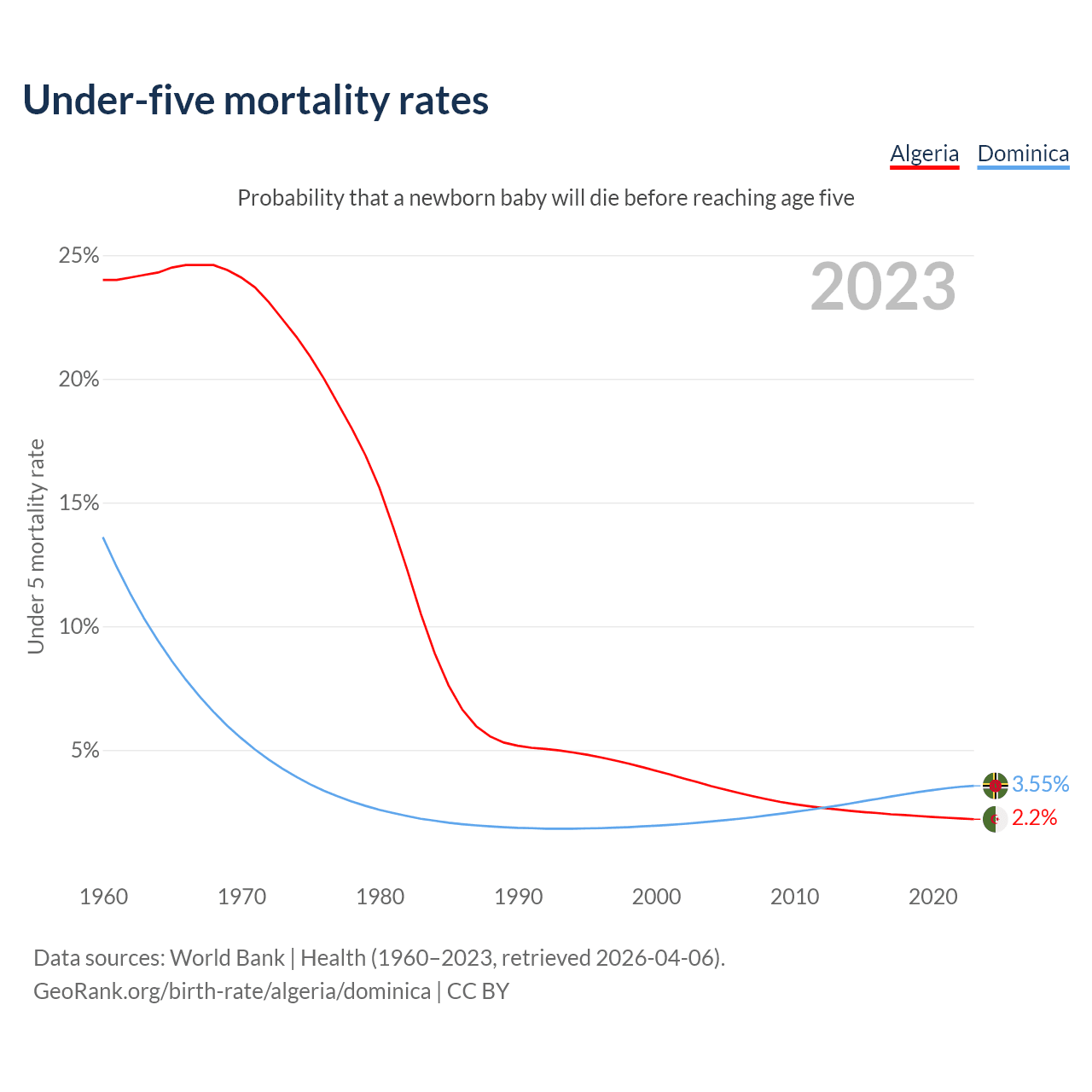 The chance that a newborn baby will die before reaching age five is 2.2% in Algeria and 3.55% in Dominica. Above is a chart with historical data on under-five mortality rates.