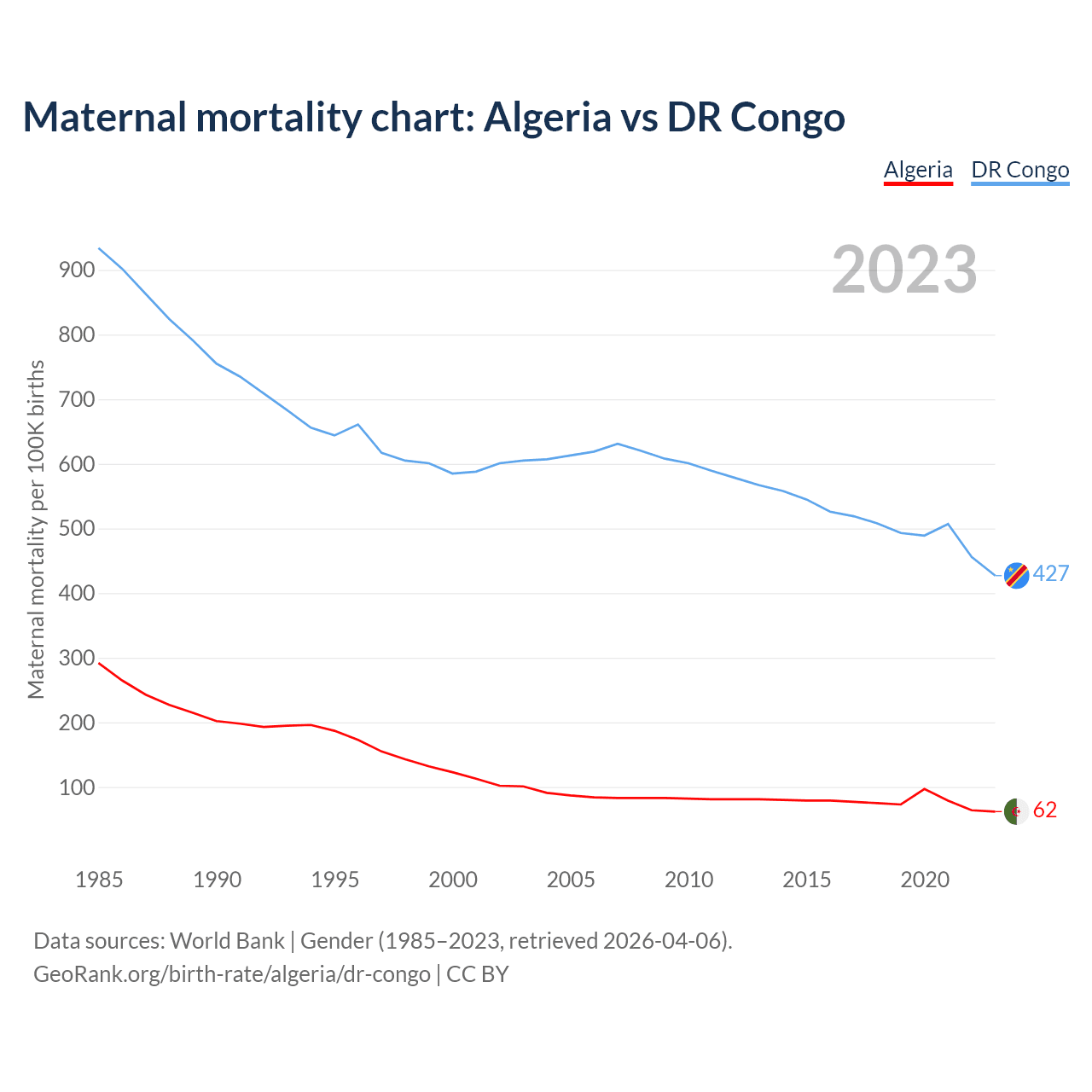 The maternal mortality rate, which is the probability of dying during childbirth or within 42 days of pregnancy termination, is 62 deaths per 100,000 live births in Algeria, compared to 427 deaths in the DR Congo.
