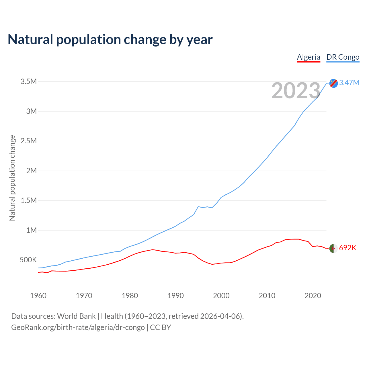 Algeria has an annual birth rate of 19.6 births per 1,000 people, compared to 41.3 for the DR Congo. The average number of children a woman is expected to have during her lifetime — the fertility rate, is 2.77 in Algeria and 6.05 in the DR Congo — 118.8% difference.