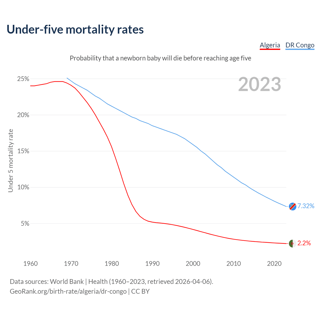 The chance that a newborn baby will die before reaching age five is 2.2% in Algeria and 7.32% in the DR Congo. Above is a chart with historical data on under-five mortality rates.
