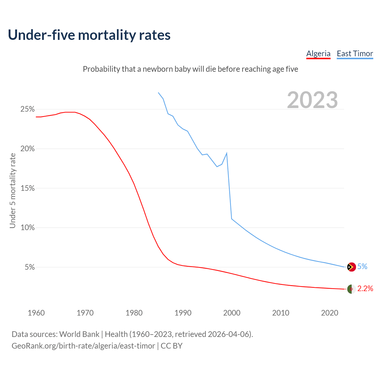 The chance that a newborn baby will die before reaching age five is 2.2% in Algeria and 5% in East Timor. Above is a chart with historical data on under-five mortality rates.