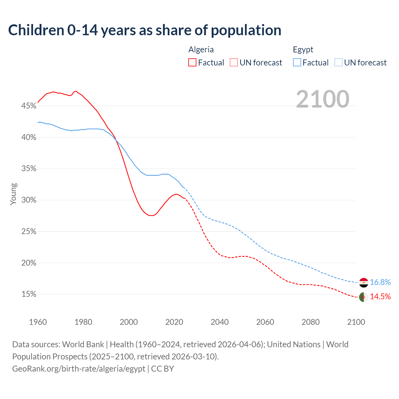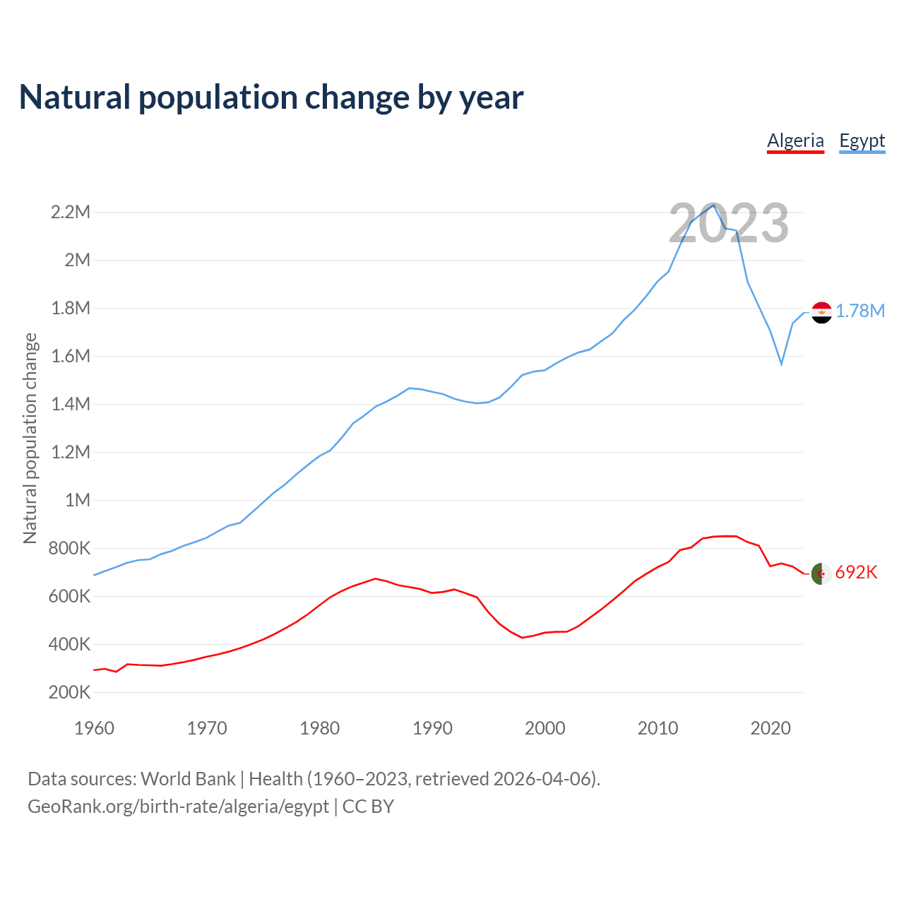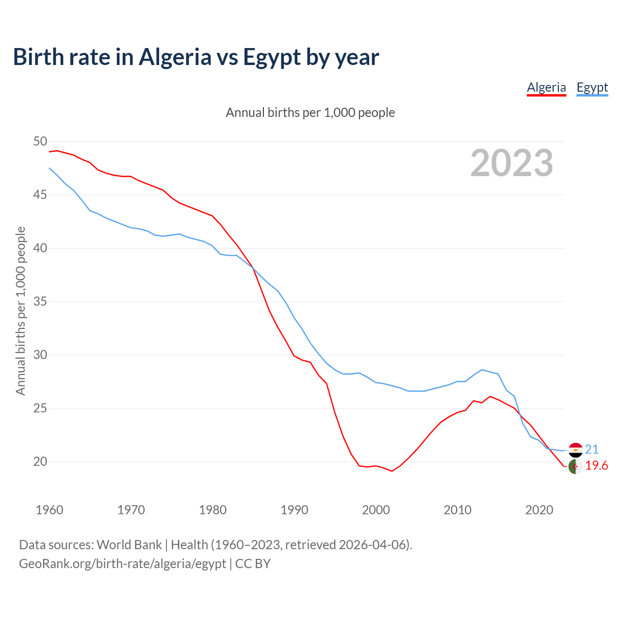 According to the latest available data on birth rates, the fertility rate in Algeria was 2.77 children per woman in 2023, compared to 2.75 in Egypt in 2023. The replacement level is considered to be 2.1 children per woman.