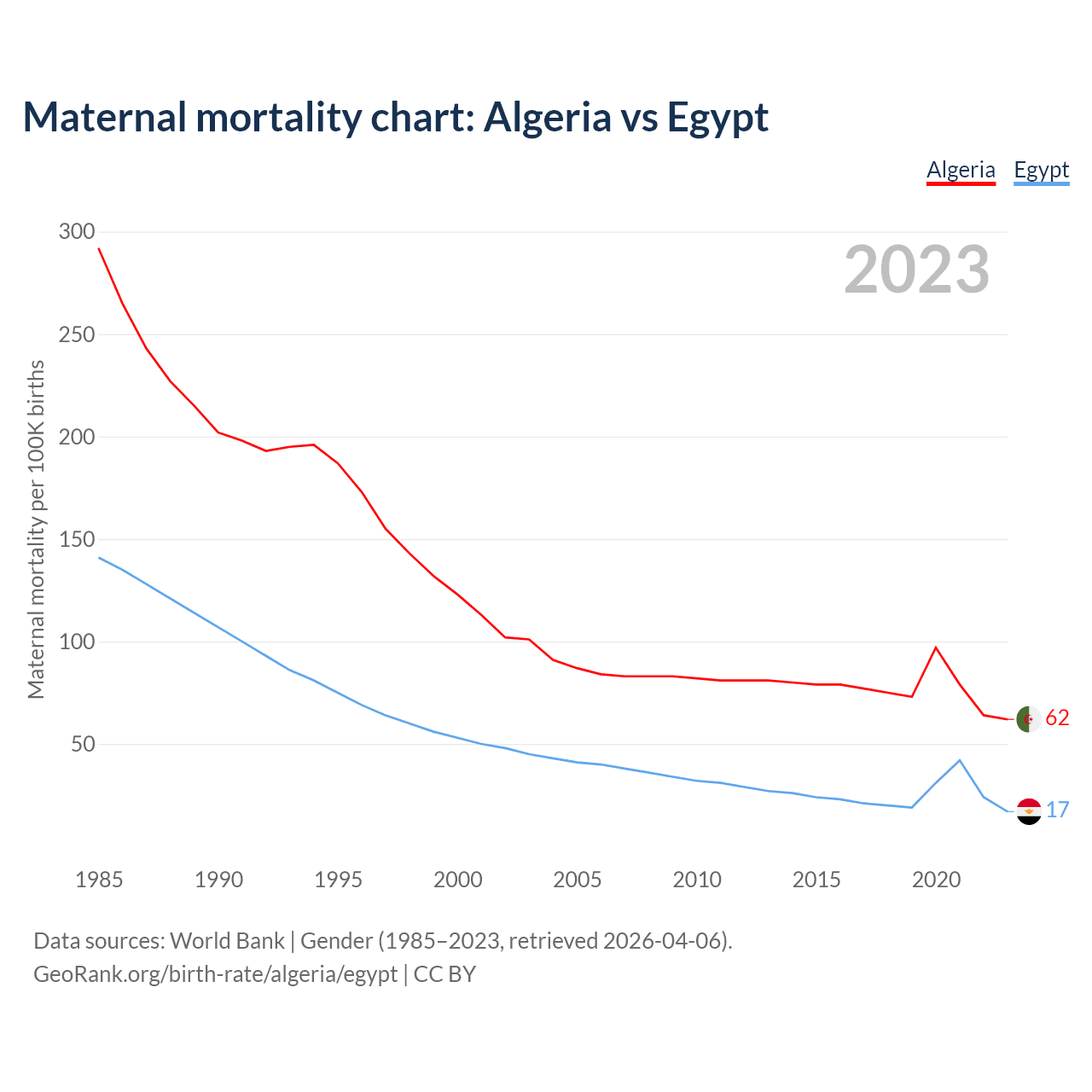 The maternal mortality rate, which is the probability of dying during childbirth or within 42 days of pregnancy termination, is 62 deaths per 100,000 live births in Algeria, compared to 17 deaths in Egypt.