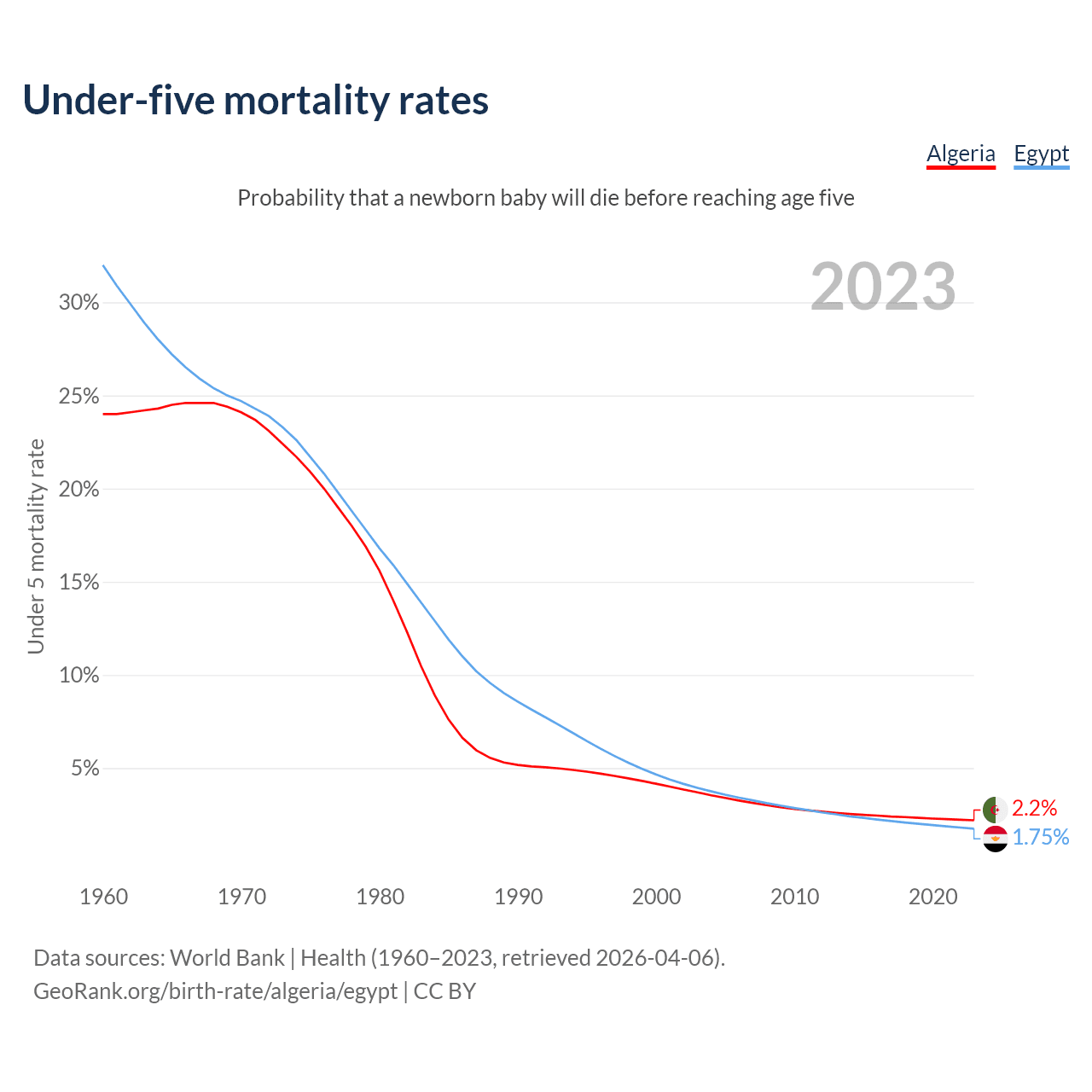 The chance that a newborn baby will die before reaching age five is 2.2% in Algeria and 1.75% in Egypt. Above is a chart with historical data on under-five mortality rates.