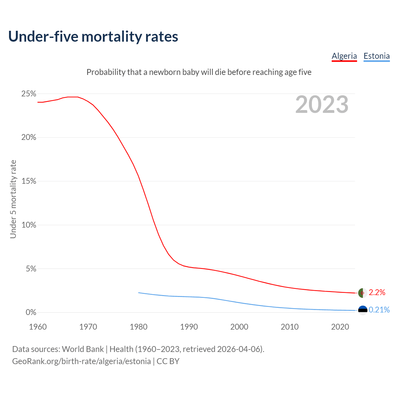 The chance that a newborn baby will die before reaching age five is 2.2% in Algeria and 0.21% in Estonia. Above is a chart with historical data on under-five mortality rates.