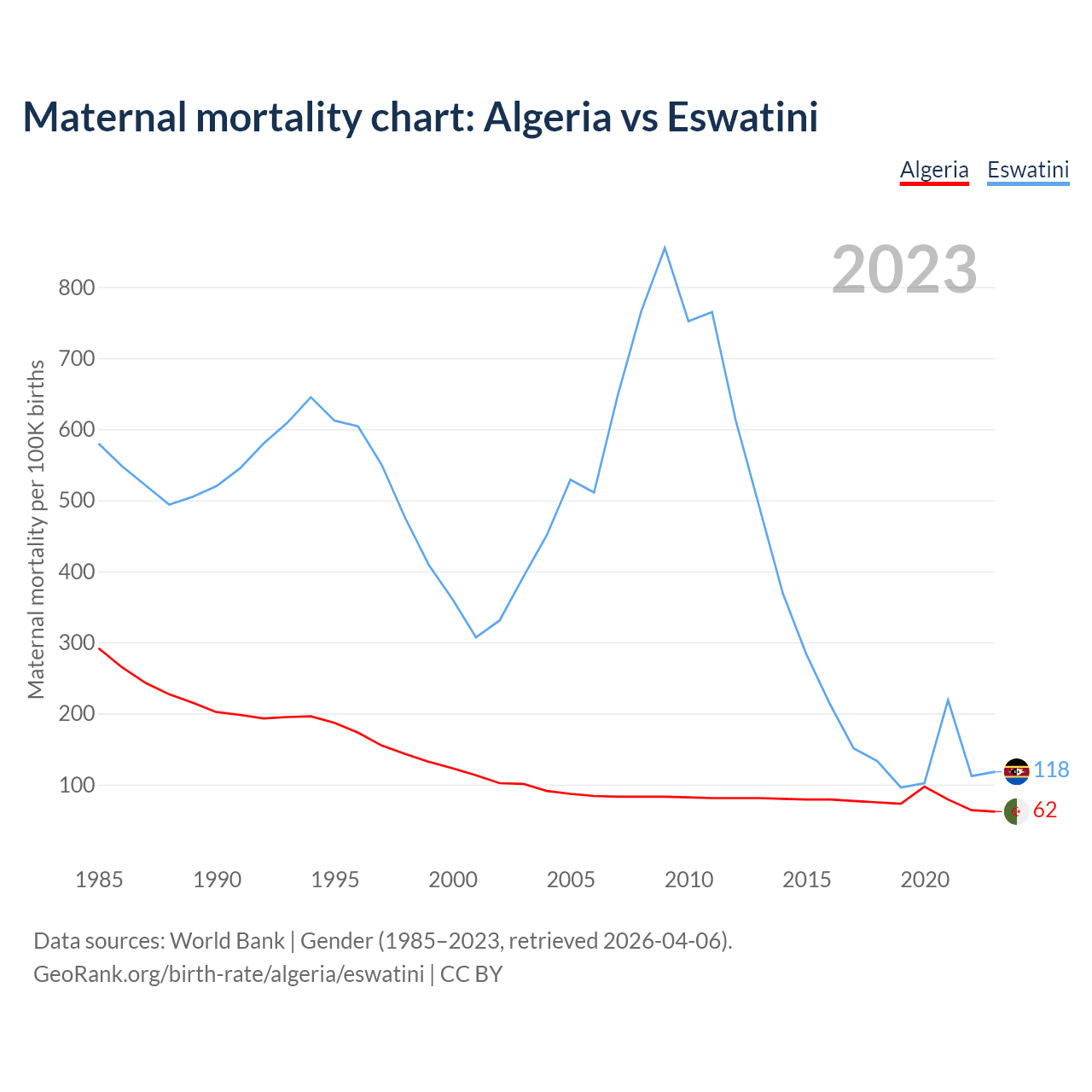 The maternal mortality rate, which is the probability of dying during childbirth or within 42 days of pregnancy termination, is 62 deaths per 100,000 live births in Algeria, compared to 118 deaths in Eswatini.