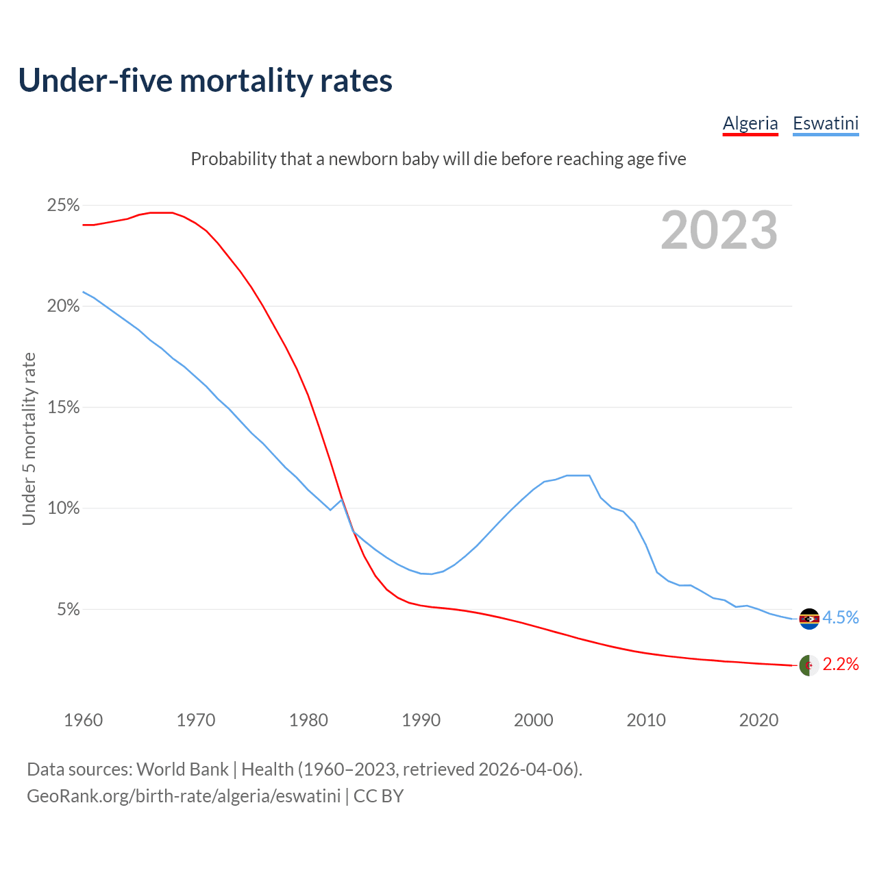 The chance that a newborn baby will die before reaching age five is 2.2% in Algeria and 4.5% in Eswatini. Above is a chart with historical data on under-five mortality rates.