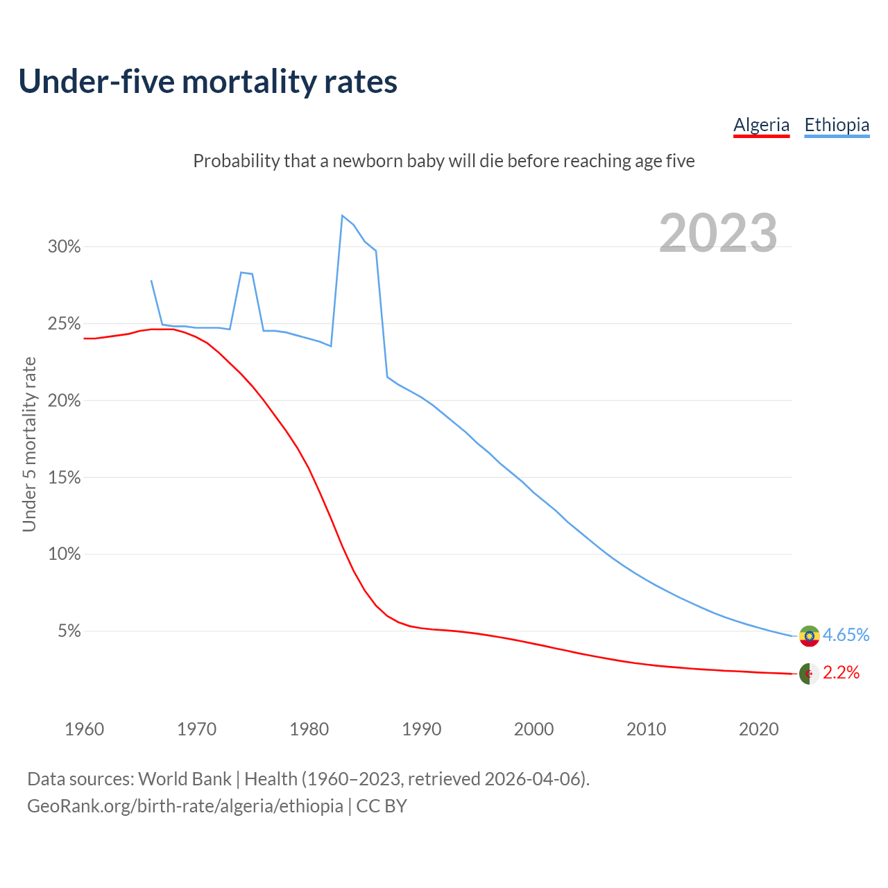 The chance that a newborn baby will die before reaching age five is 2.2% in Algeria and 4.65% in Ethiopia. Above is a chart with historical data on under-five mortality rates.