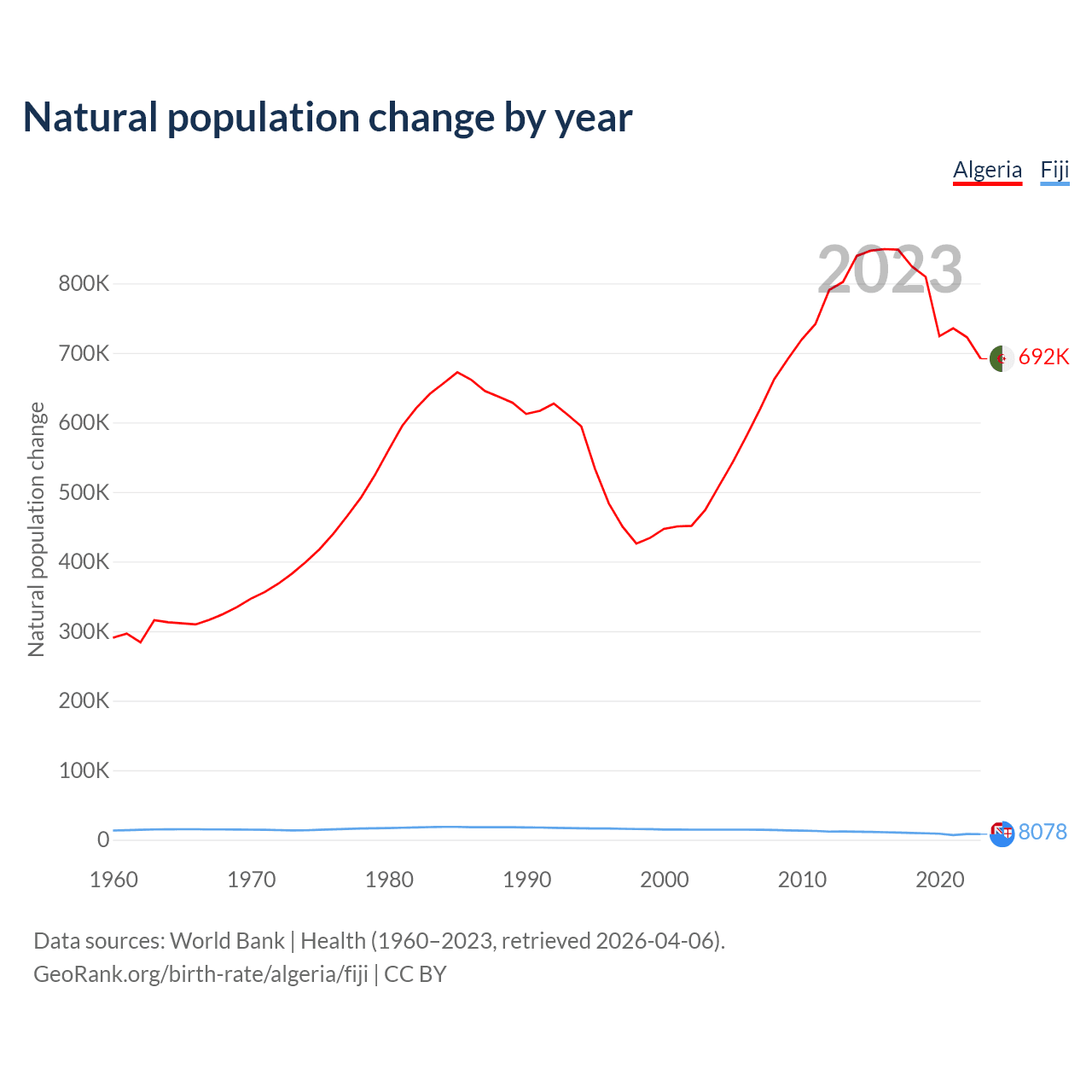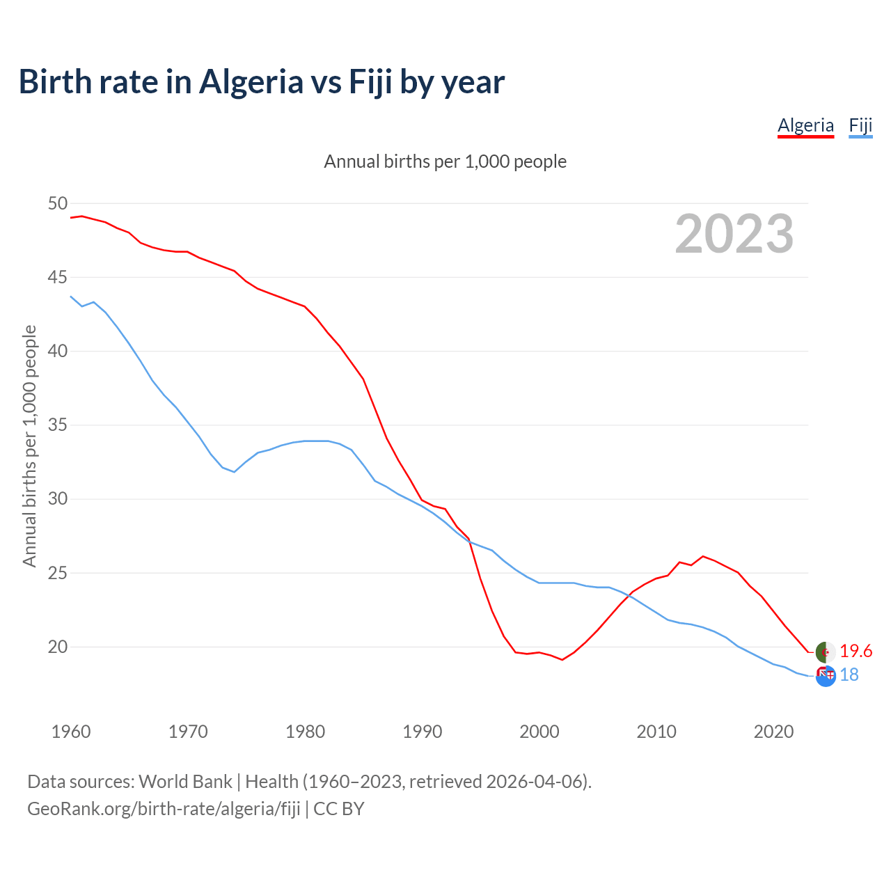 Algeria has an annual birth rate of 19.6 births per 1,000 people, compared to 18 for Fiji. The average number of children a woman is expected to have during her lifetime — the fertility rate, is 2.77 in Algeria and 2.28 in Fiji — 17.5% difference.