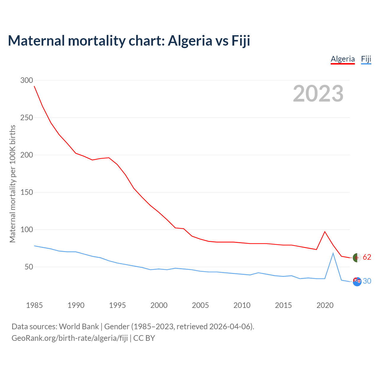The maternal mortality rate, which is the probability of dying during childbirth or within 42 days of pregnancy termination, is 62 deaths per 100,000 live births in Algeria, compared to 30 deaths in Fiji.
