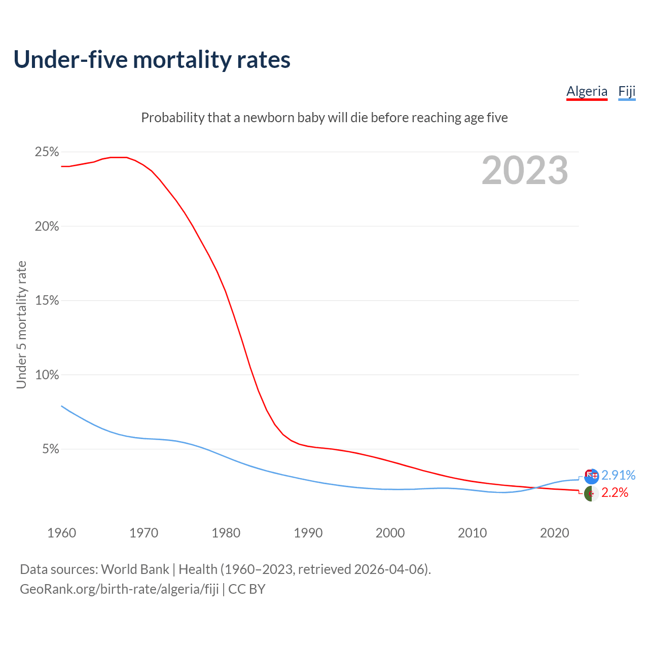 The chance that a newborn baby will die before reaching age five is 2.2% in Algeria and 2.91% in Fiji. Above is a chart with historical data on under-five mortality rates.