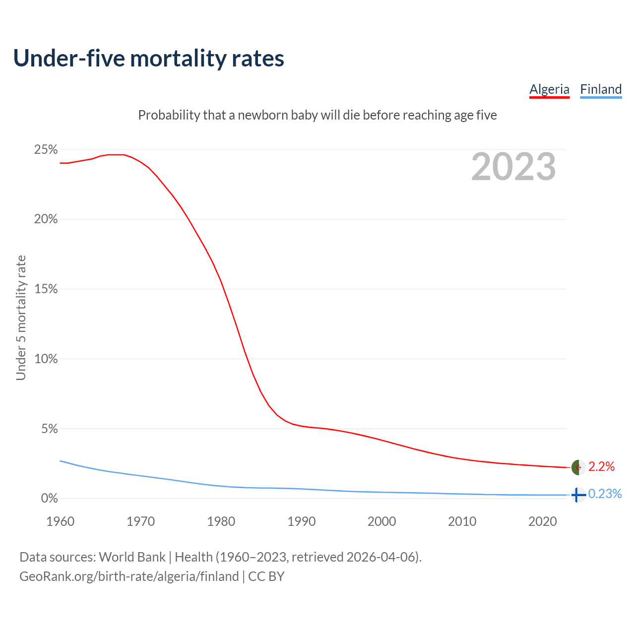 The chance that a newborn baby will die before reaching age five is 2.2% in Algeria and 0.23% in Finland. Above is a chart with historical data on under-five mortality rates.