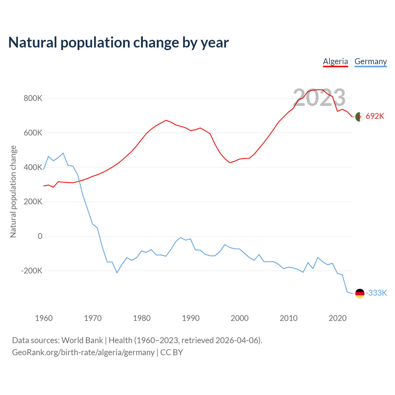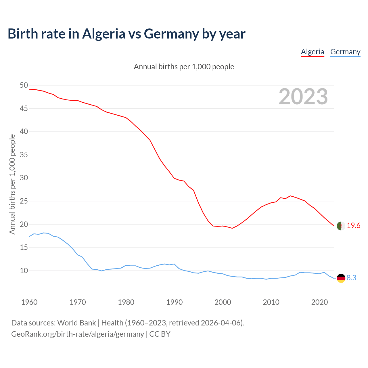 Algeria has an annual birth rate of 19.6 births per 1,000 people, compared to 8.3 for Germany. The average number of children a woman is expected to have during her lifetime — the fertility rate, is 2.77 in Algeria and 1.39 in Germany — 49.7% difference.
