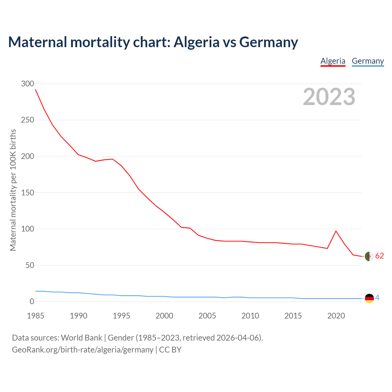 The maternal mortality rate, which is the probability of dying during childbirth or within 42 days of pregnancy termination, is 62 deaths per 100,000 live births in Algeria, compared to 4 deaths in Germany.