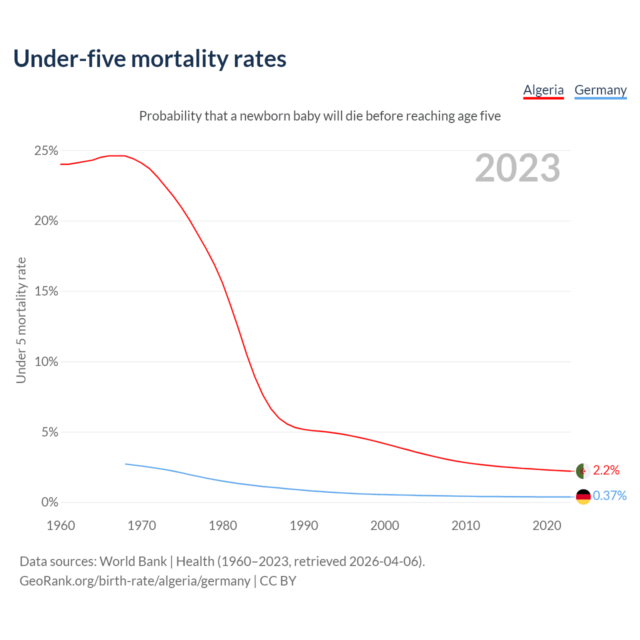 The chance that a newborn baby will die before reaching age five is 2.2% in Algeria and 0.37% in Germany. Above is a chart with historical data on under-five mortality rates.
