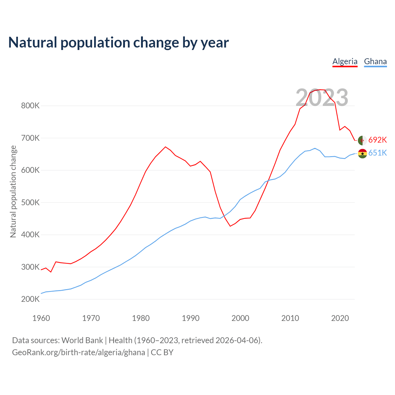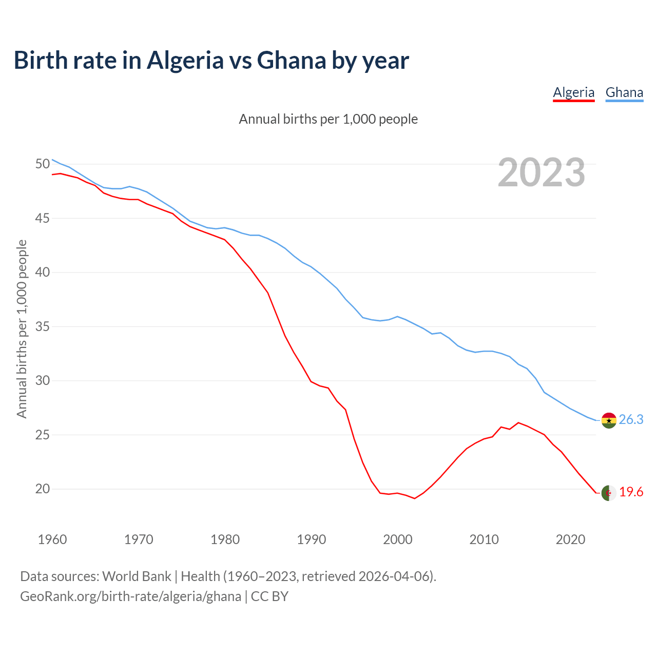 Algeria has an annual birth rate of 19.6 births per 1,000 people, compared to 26.3 for Ghana. The average number of children a woman is expected to have during her lifetime — the fertility rate, is 2.77 in Algeria and 3.4 in Ghana — 22.8% difference.