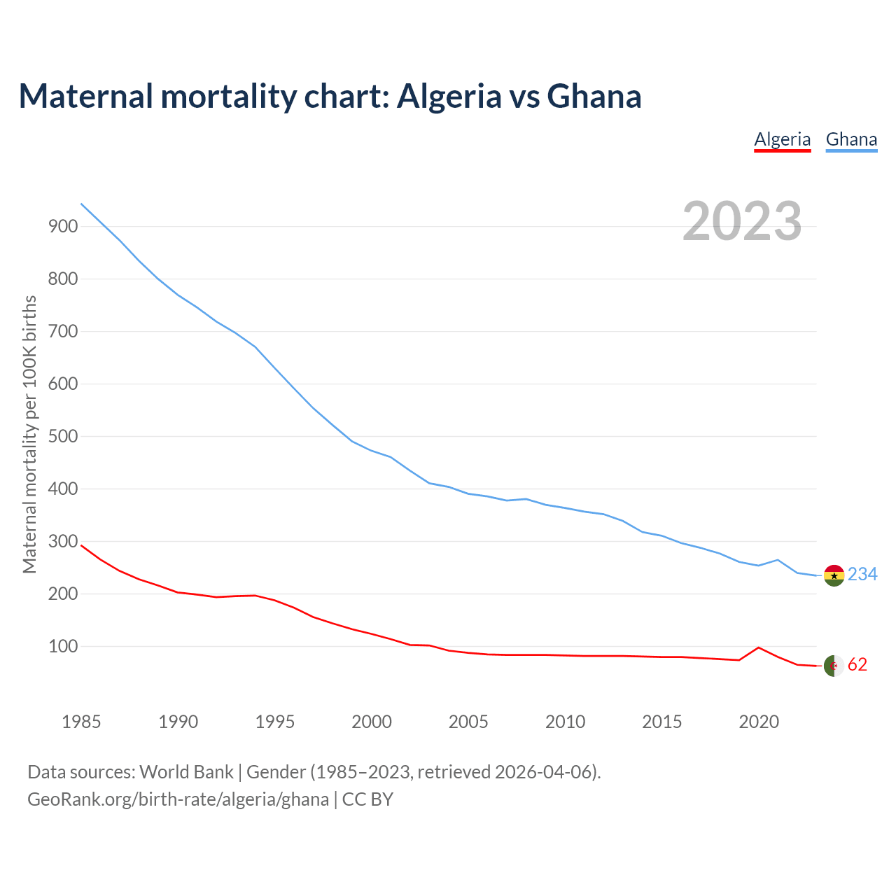 The maternal mortality rate, which is the probability of dying during childbirth or within 42 days of pregnancy termination, is 62 deaths per 100,000 live births in Algeria, compared to 234 deaths in Ghana.