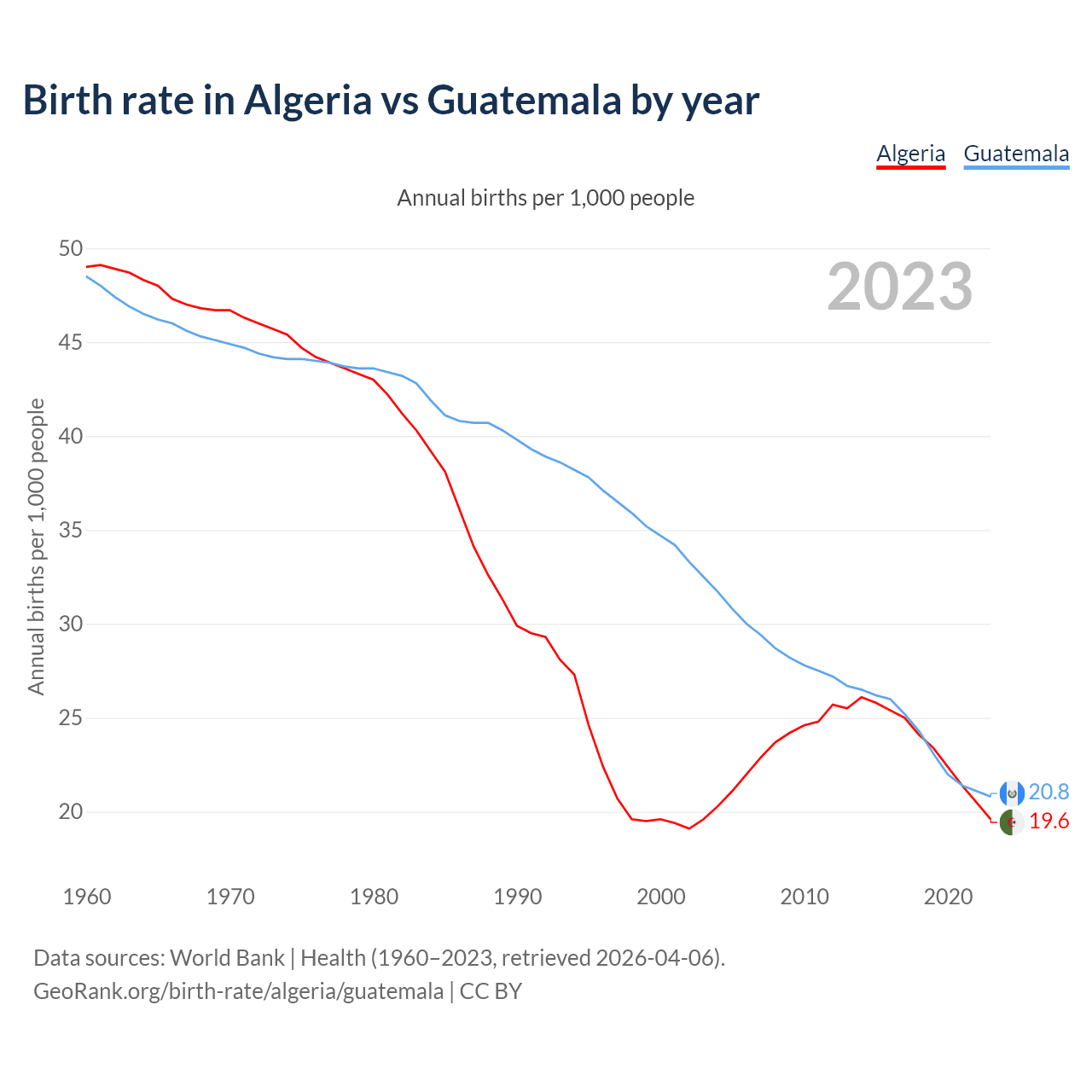 Algeria has an annual birth rate of 19.6 births per 1,000 people, compared to 20.8 for Guatemala. The average number of children a woman is expected to have during her lifetime — the fertility rate, is 2.77 in Algeria and 2.31 in Guatemala — 16.4% difference.