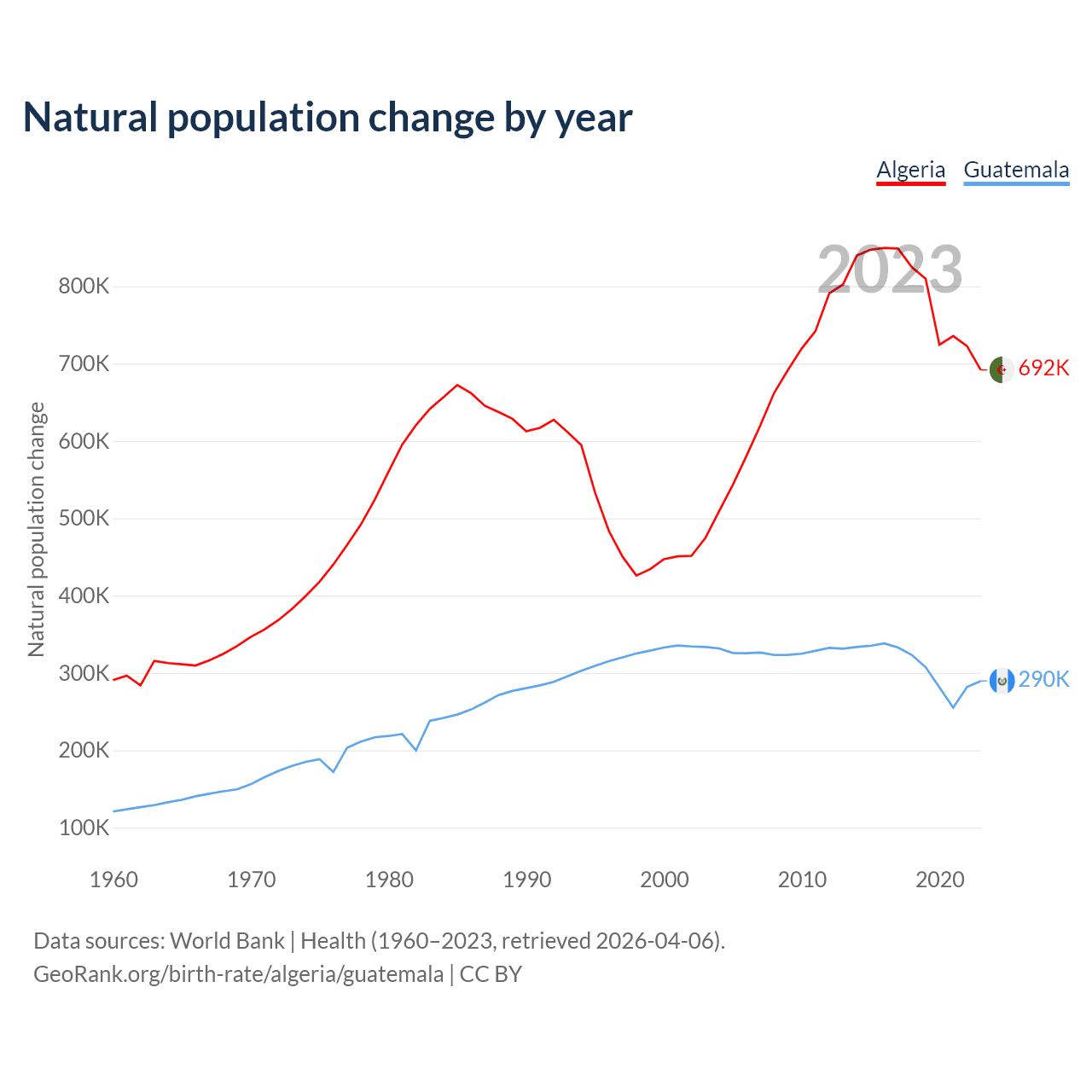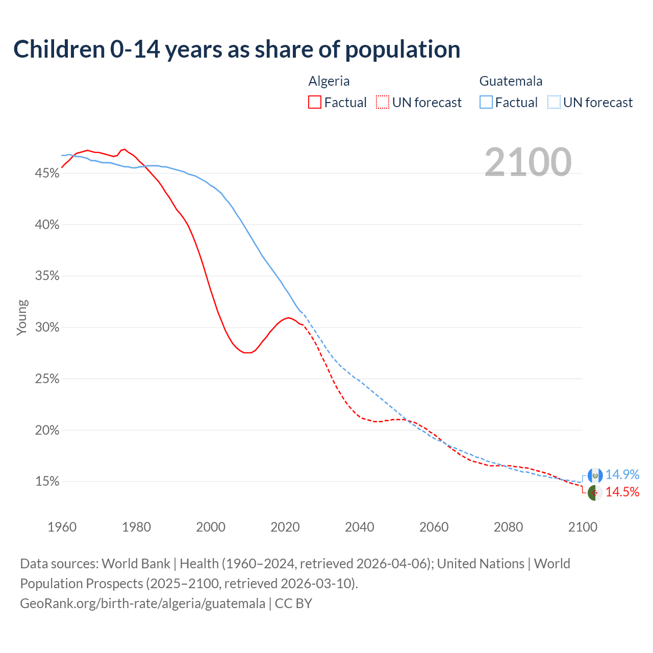 According to the latest available data on birth rates, the fertility rate in Algeria was 2.77 children per woman in 2023, compared to 2.31 in Guatemala in 2023. The replacement level is considered to be 2.1 children per woman.