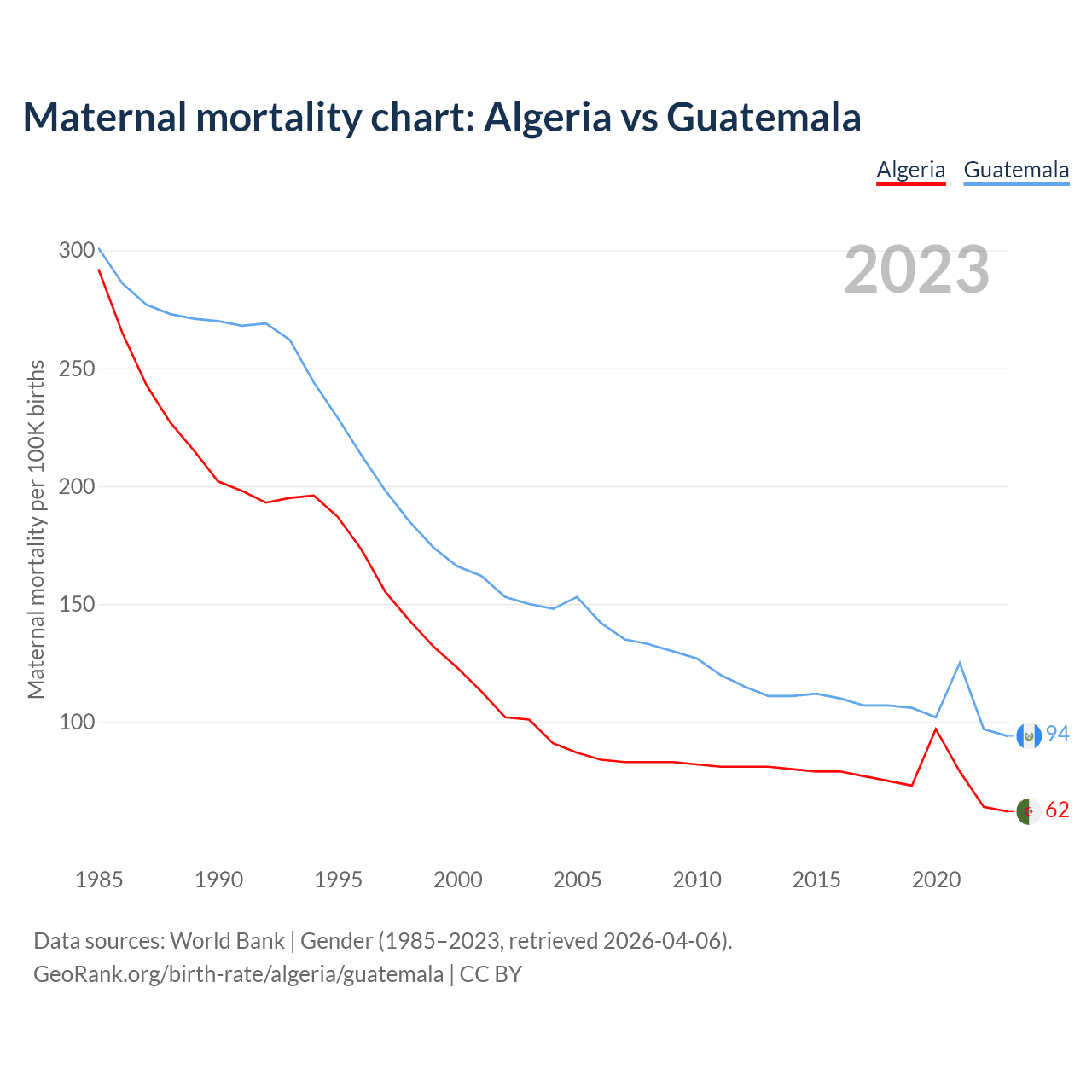 The maternal mortality rate, which is the probability of dying during childbirth or within 42 days of pregnancy termination, is 62 deaths per 100,000 live births in Algeria, compared to 94 deaths in Guatemala.