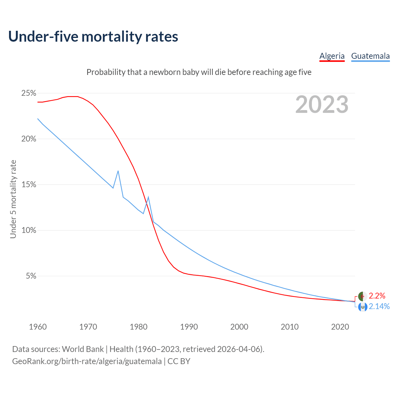 The chance that a newborn baby will die before reaching age five is 2.2% in Algeria and 2.14% in Guatemala. Above is a chart with historical data on under-five mortality rates.