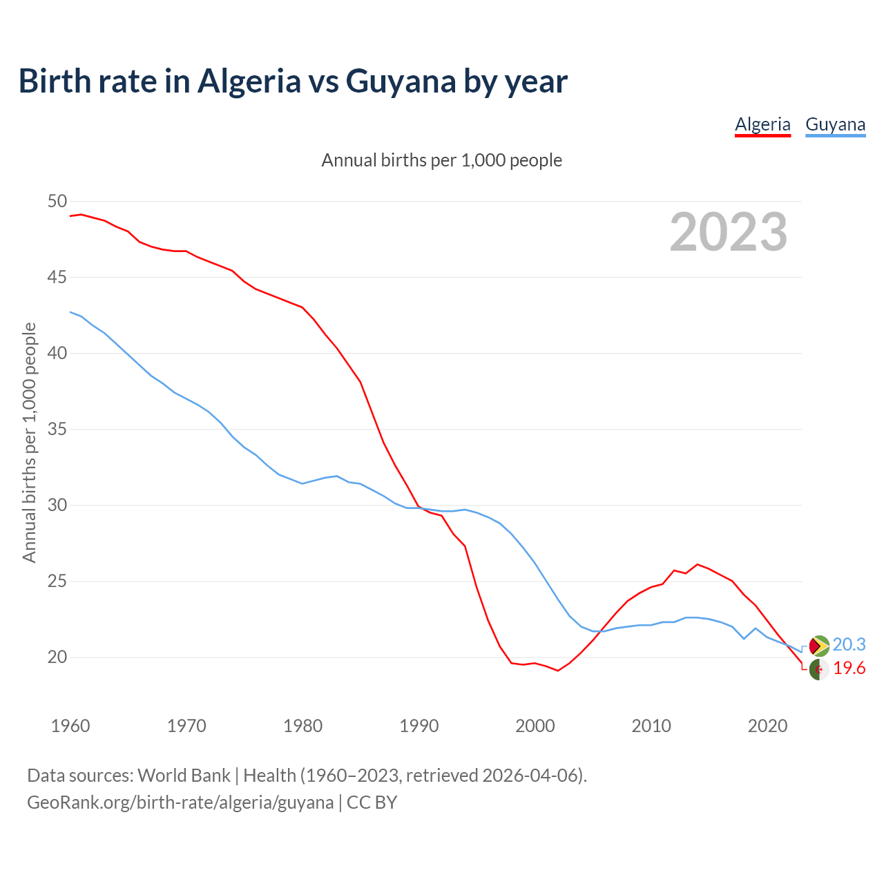 Algeria has an annual birth rate of 19.6 births per 1,000 people, compared to 20.3 for Guyana. The average number of children a woman is expected to have during her lifetime — the fertility rate, is 2.77 in Algeria and 2.41 in Guyana — 12.8% difference.