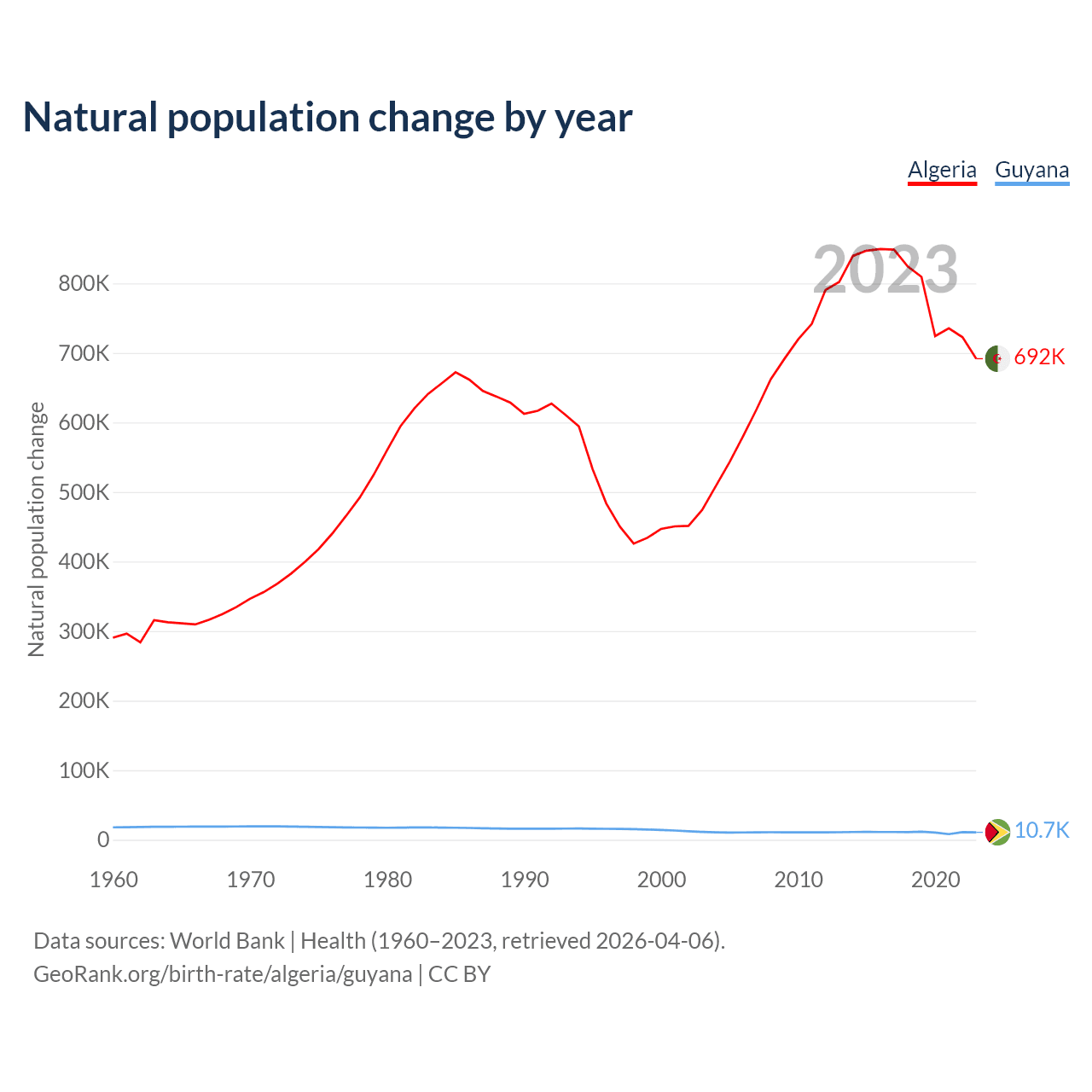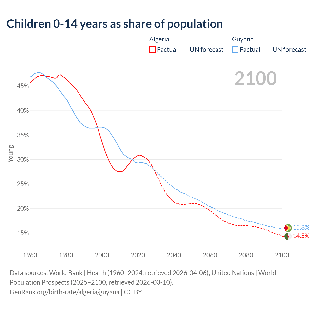 According to the latest available data on birth rates, the fertility rate in Algeria was 2.77 children per woman in 2023, compared to 2.41 in Guyana in 2023. The replacement level is considered to be 2.1 children per woman.