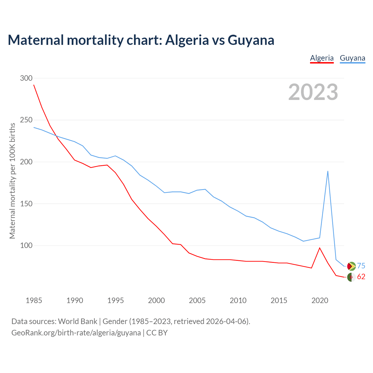 The maternal mortality rate, which is the probability of dying during childbirth or within 42 days of pregnancy termination, is 62 deaths per 100,000 live births in Algeria, compared to 75 deaths in Guyana.