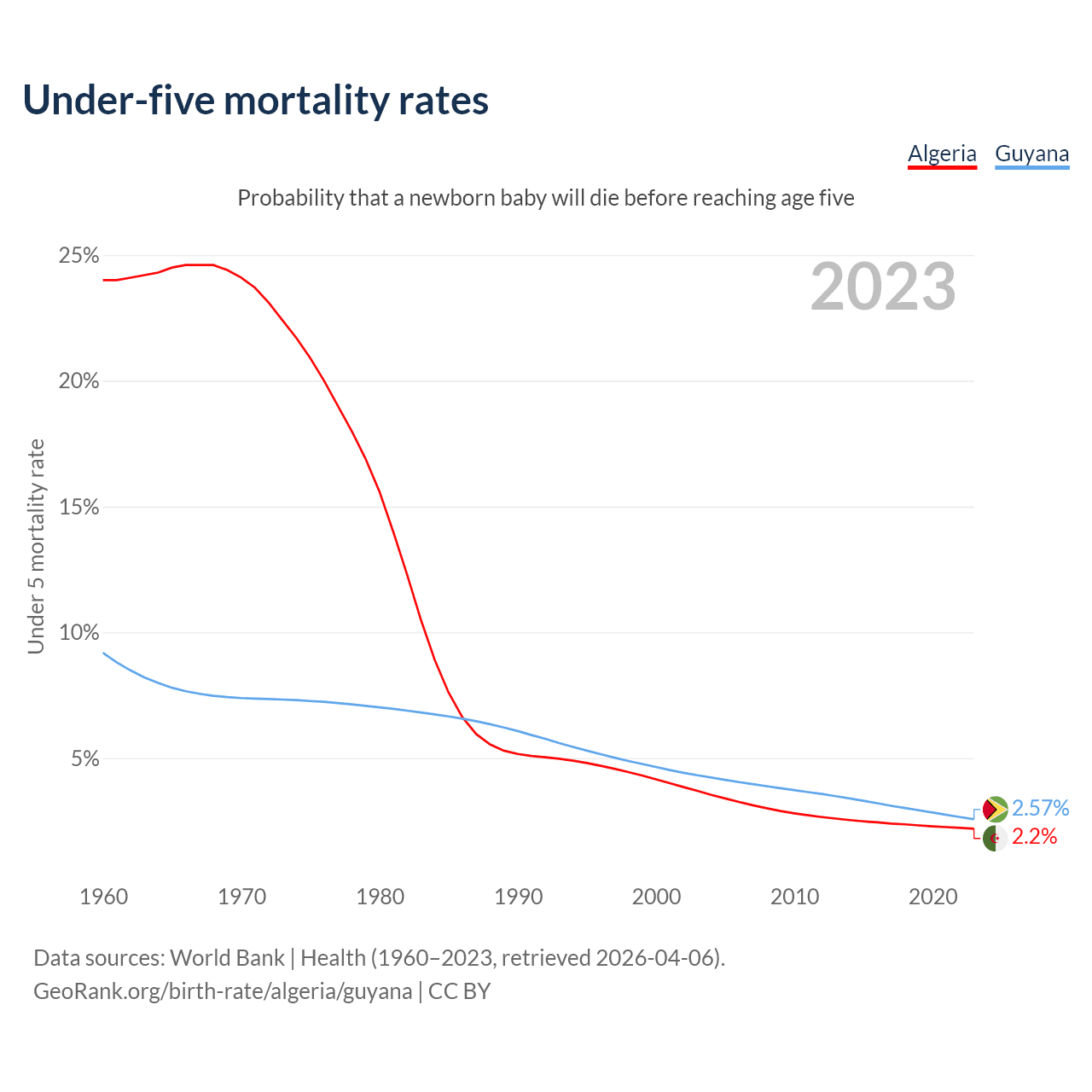 The chance that a newborn baby will die before reaching age five is 2.2% in Algeria and 2.57% in Guyana. Above is a chart with historical data on under-five mortality rates.