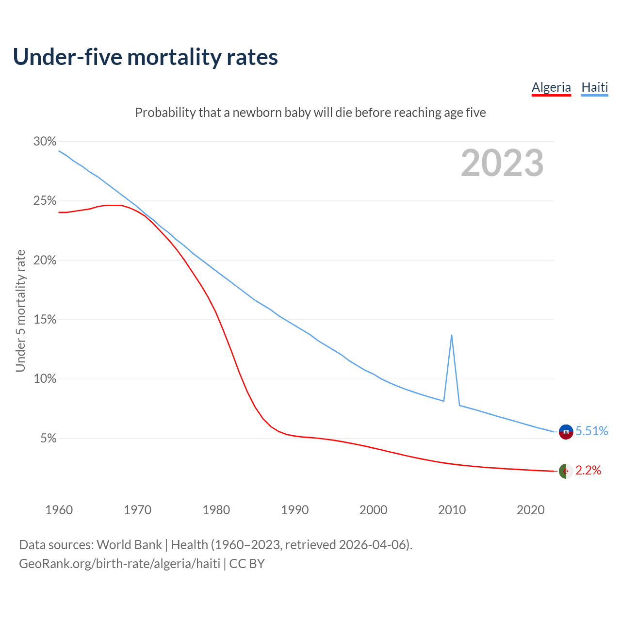 The chance that a newborn baby will die before reaching age five is 2.2% in Algeria and 5.51% in Haiti. Above is a chart with historical data on under-five mortality rates.