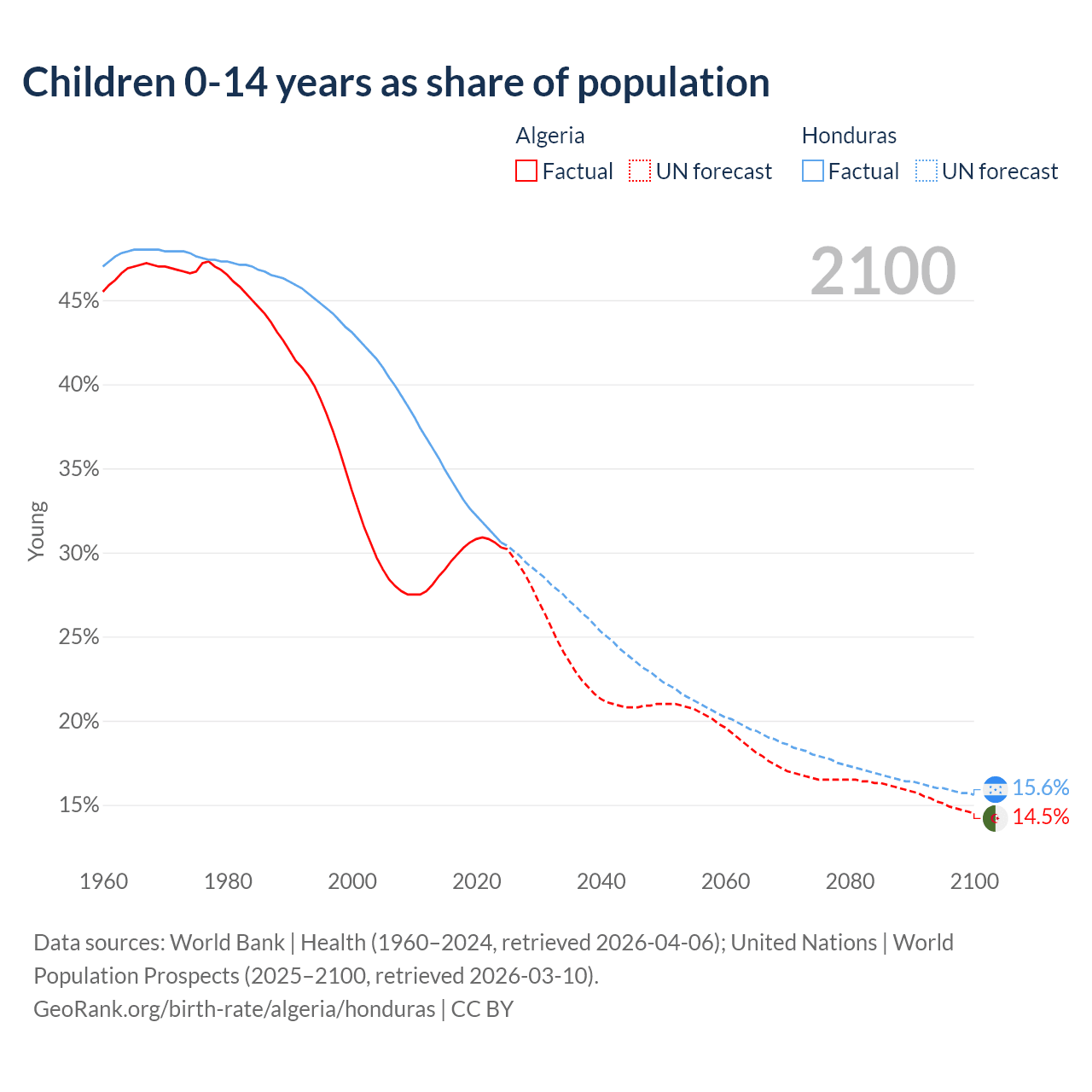 According to the latest available data on birth rates, the fertility rate in Algeria was 2.77 children per woman in 2023, compared to 2.5 in Honduras in 2023. The replacement level is considered to be 2.1 children per woman.