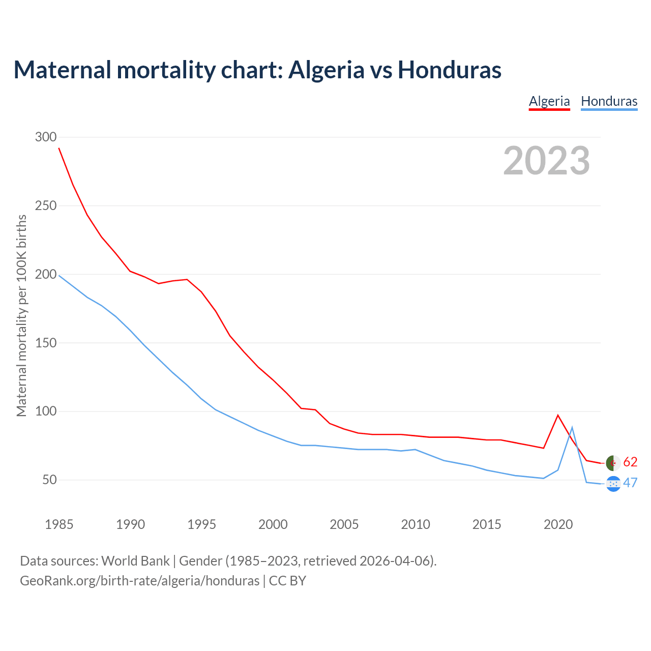 The maternal mortality rate, which is the probability of dying during childbirth or within 42 days of pregnancy termination, is 62 deaths per 100,000 live births in Algeria, compared to 47 deaths in Honduras.