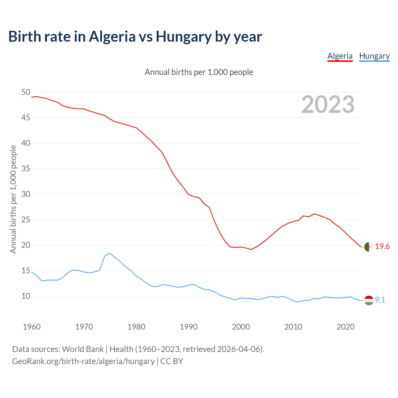 Algeria has an annual birth rate of 19.6 births per 1,000 people, compared to 9.1 for Hungary. The average number of children a woman is expected to have during her lifetime — the fertility rate, is 2.77 in Algeria and 1.51 in Hungary — 45.4% difference.