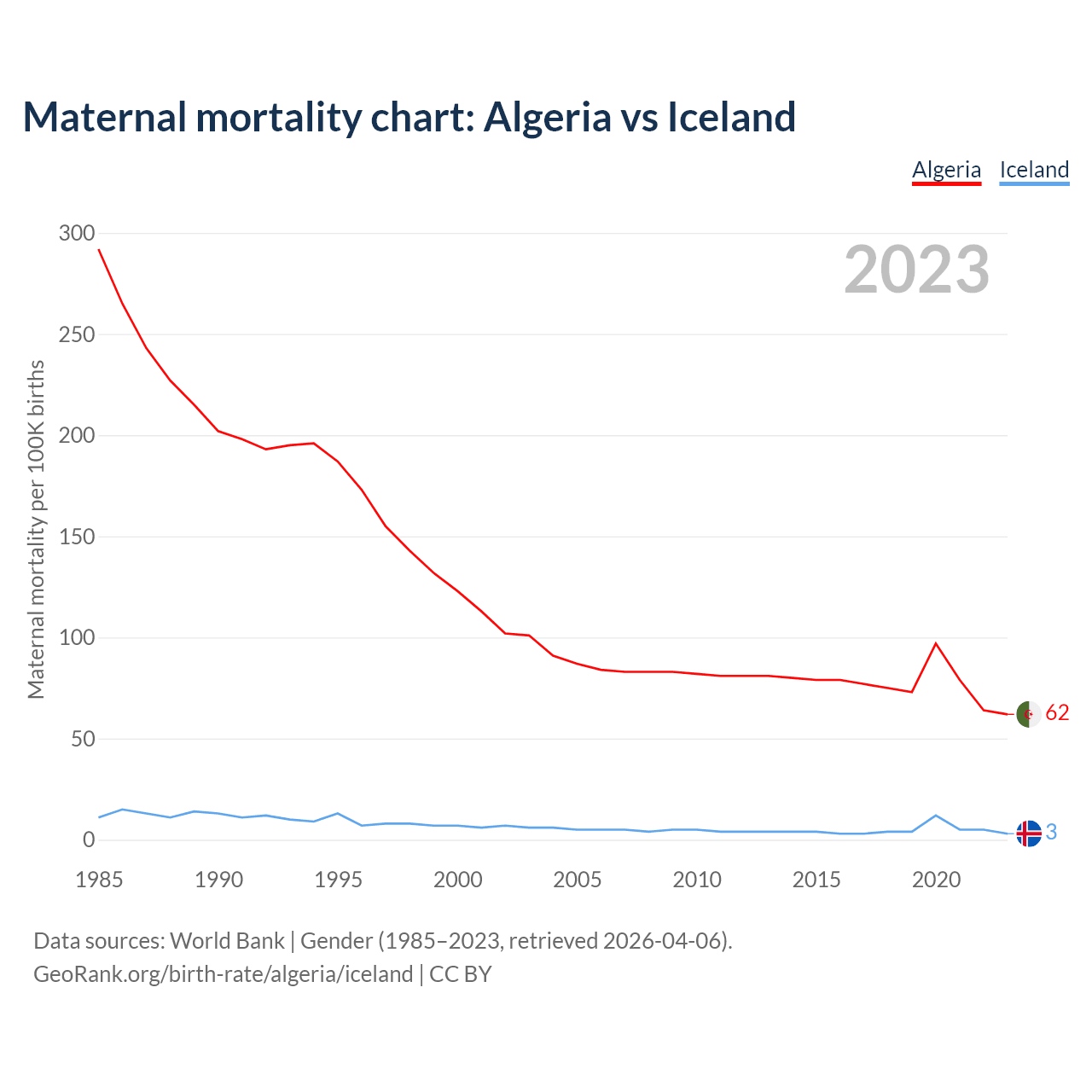 The maternal mortality rate, which is the probability of dying during childbirth or within 42 days of pregnancy termination, is 62 deaths per 100,000 live births in Algeria, compared to 3 deaths in Iceland.