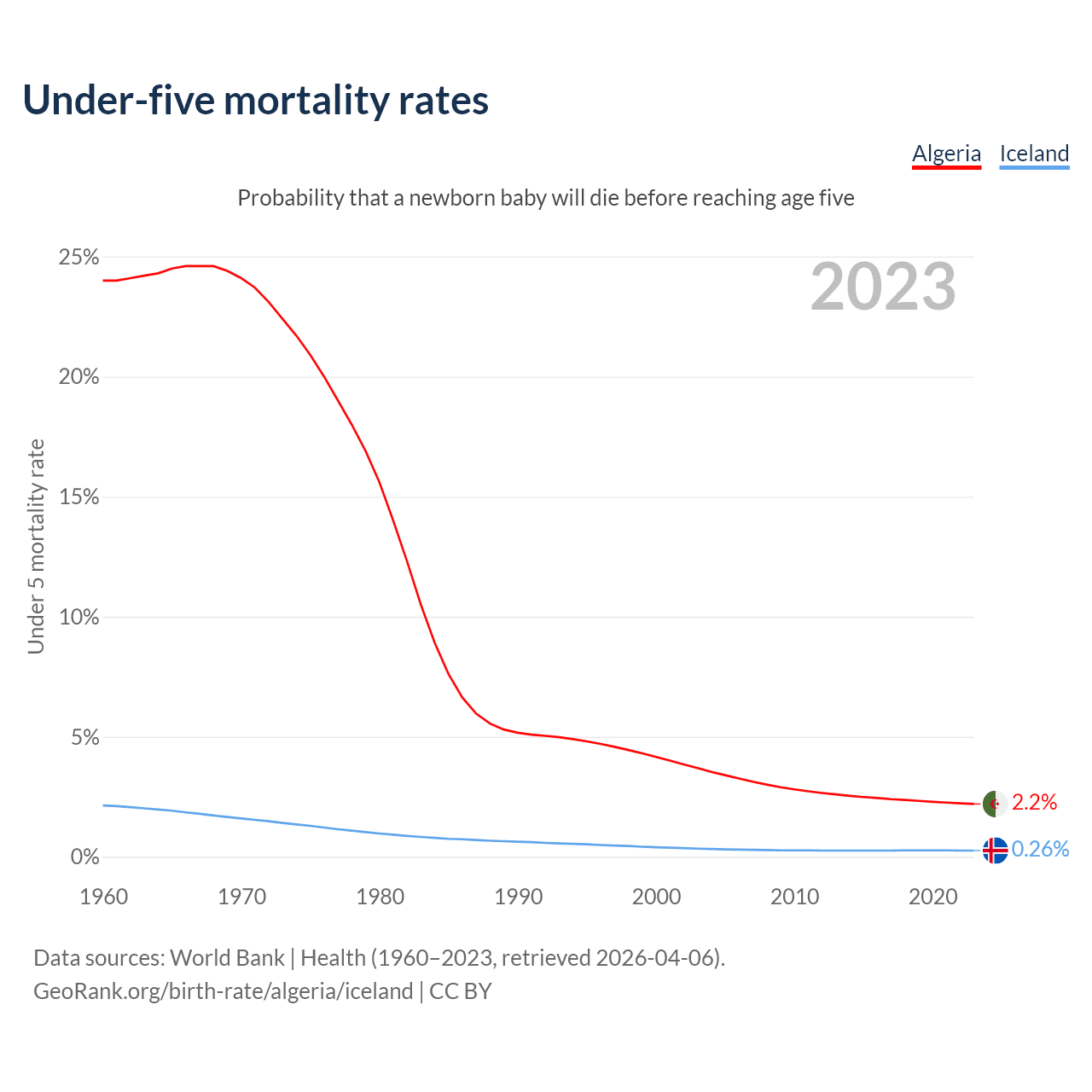 The chance that a newborn baby will die before reaching age five is 2.2% in Algeria and 0.26% in Iceland. Above is a chart with historical data on under-five mortality rates.