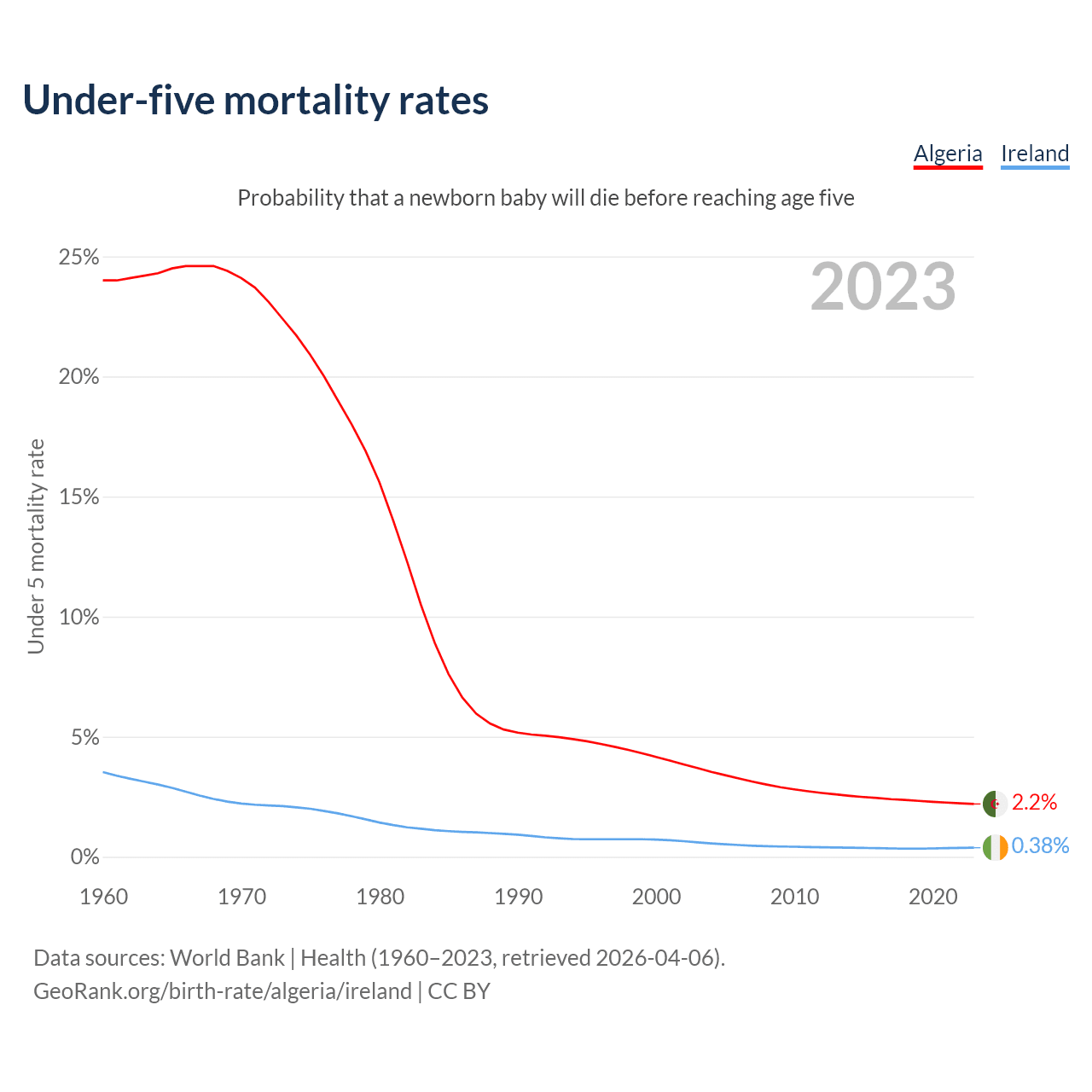The chance that a newborn baby will die before reaching age five is 2.2% in Algeria and 0.38% in Ireland. Above is a chart with historical data on under-five mortality rates.