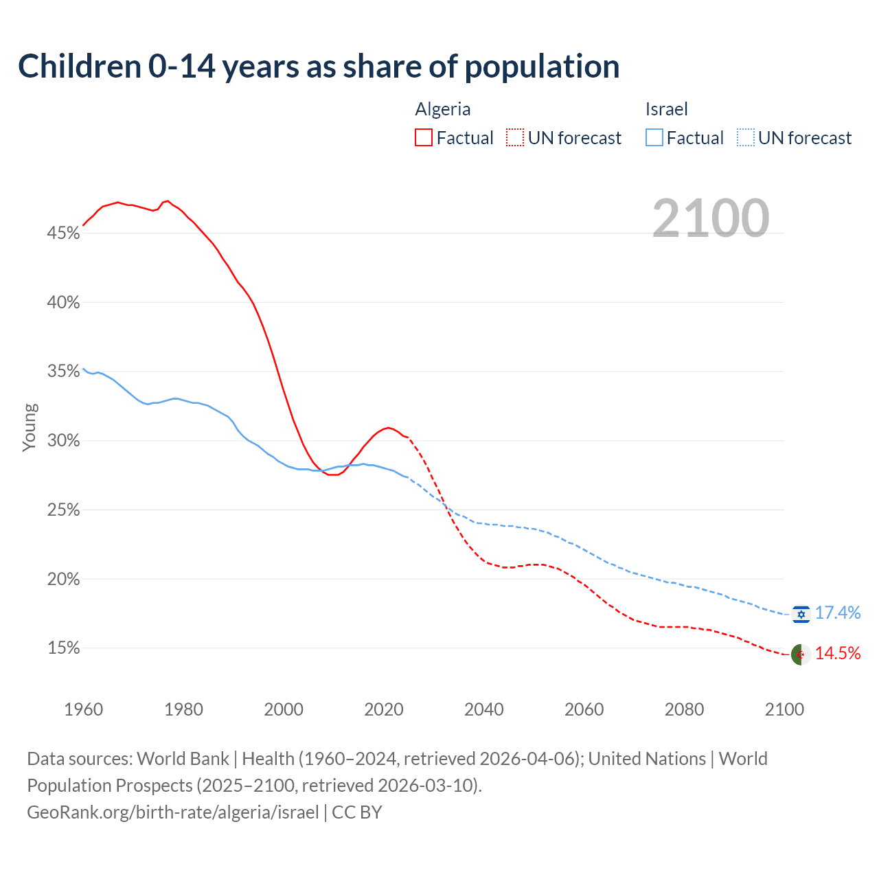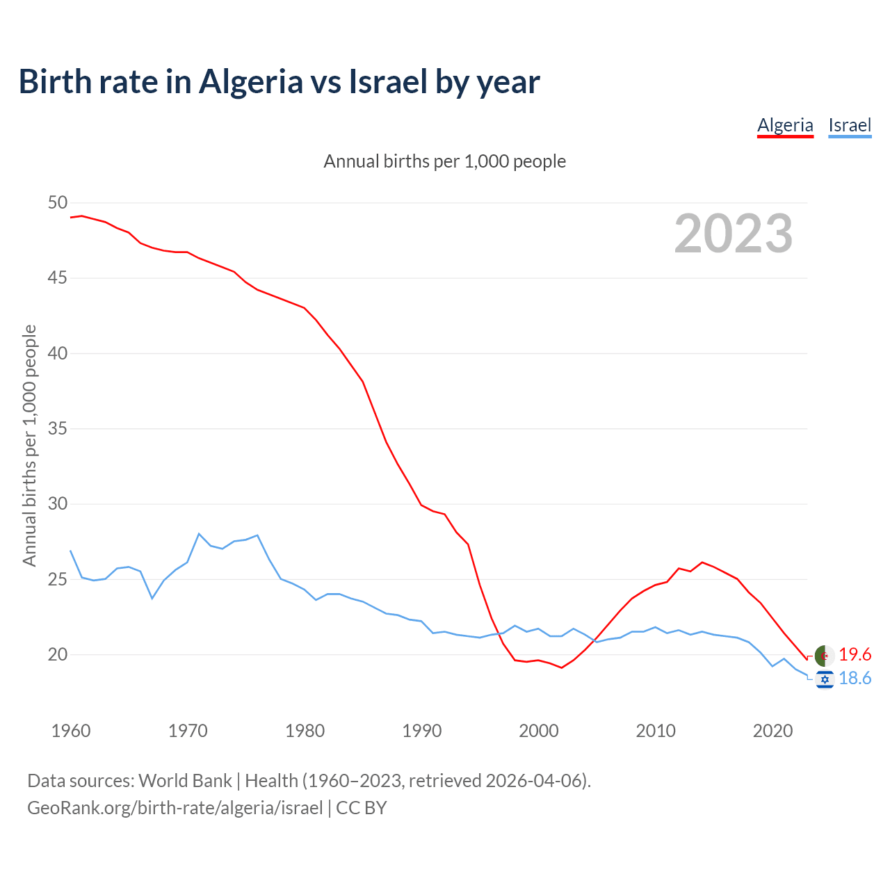 Algeria has an annual birth rate of 19.6 births per 1,000 people, compared to 18.6 for Israel. The average number of children a woman is expected to have during her lifetime — the fertility rate, is 2.77 in Algeria and 2.85 in Israel — 3.04% difference.