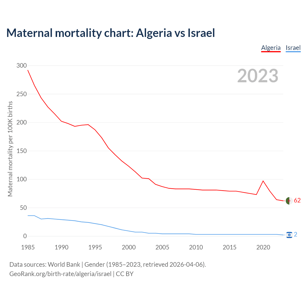 The maternal mortality rate, which is the probability of dying during childbirth or within 42 days of pregnancy termination, is 62 deaths per 100,000 live births in Algeria, compared to 2 deaths in Israel.