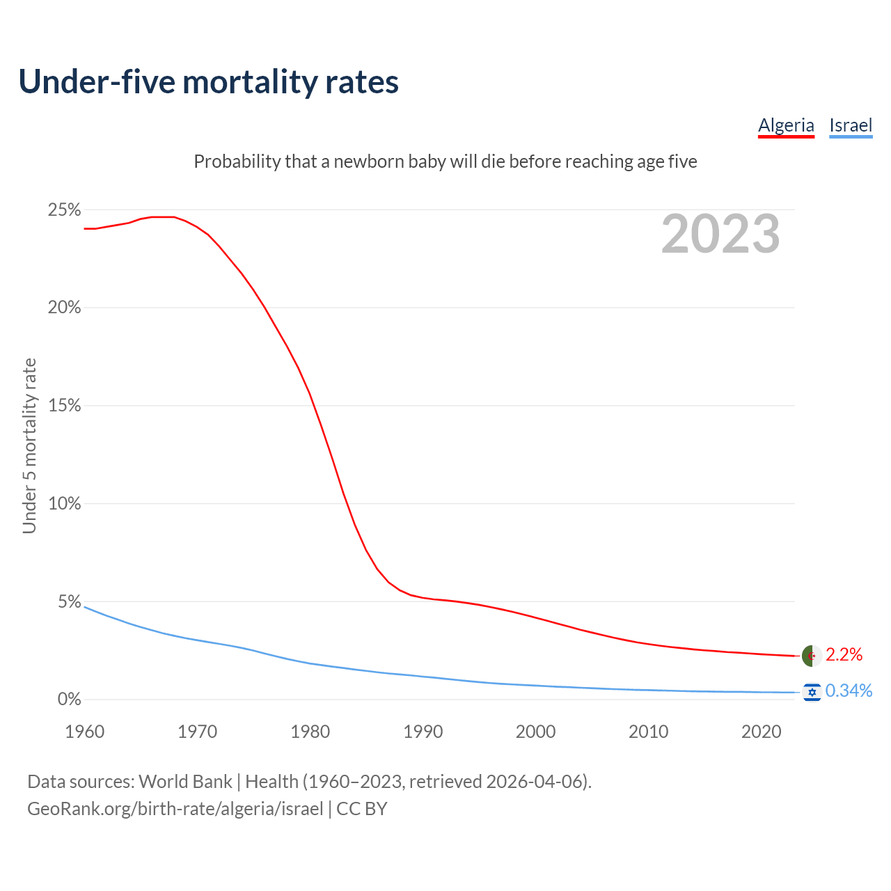 The chance that a newborn baby will die before reaching age five is 2.2% in Algeria and 0.34% in Israel. Above is a chart with historical data on under-five mortality rates.