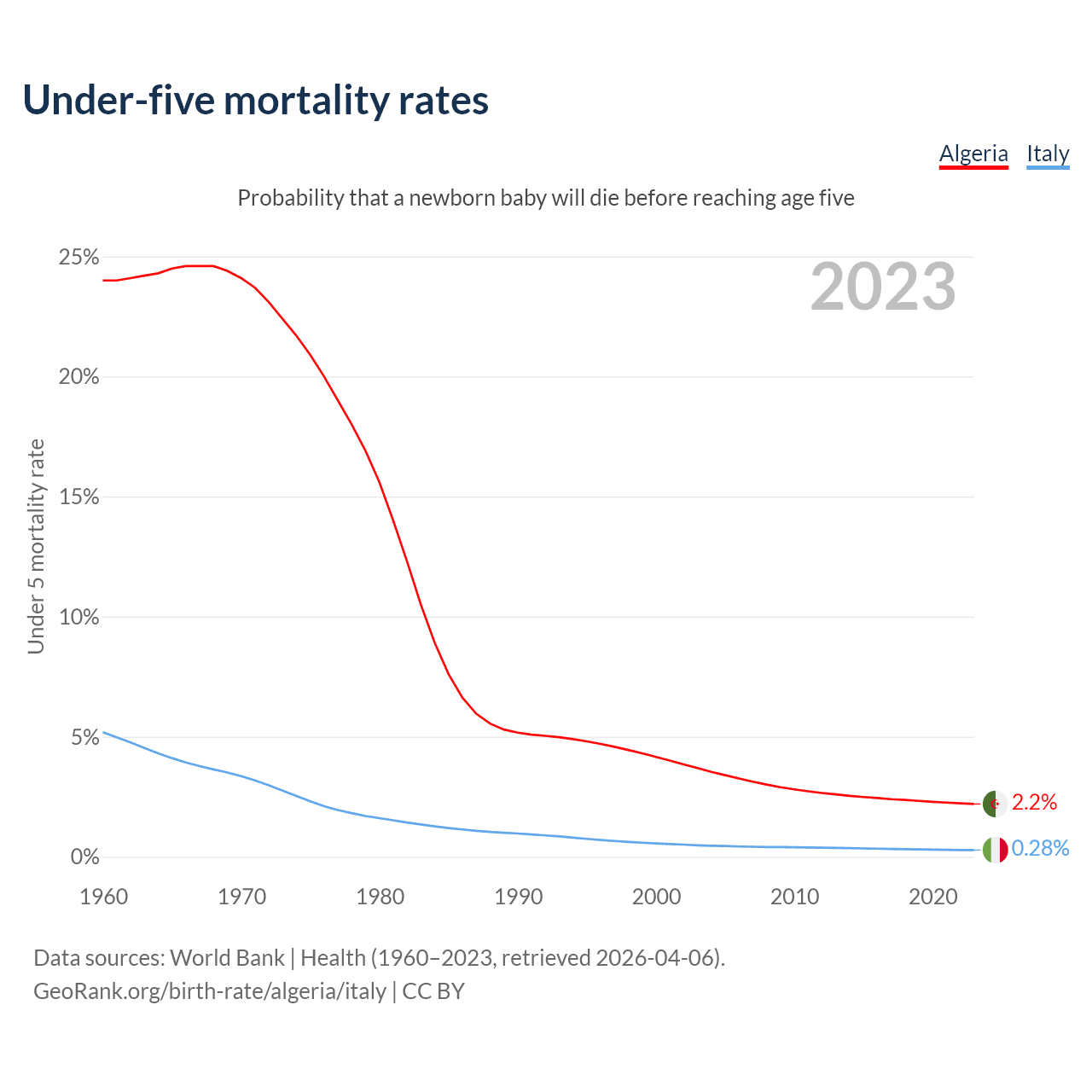 The chance that a newborn baby will die before reaching age five is 2.2% in Algeria and 0.28% in Italy. Above is a chart with historical data on under-five mortality rates.